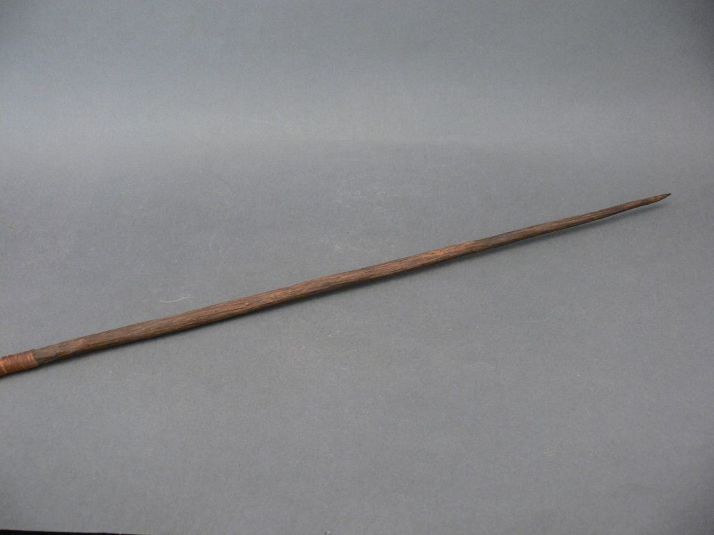 Kétrészes nyílvessző. A bambuszból metszett, behasított végű szárba növényi rosttal rögzítették a keményfából faragott, kerek keresztmetszetű hegyet.