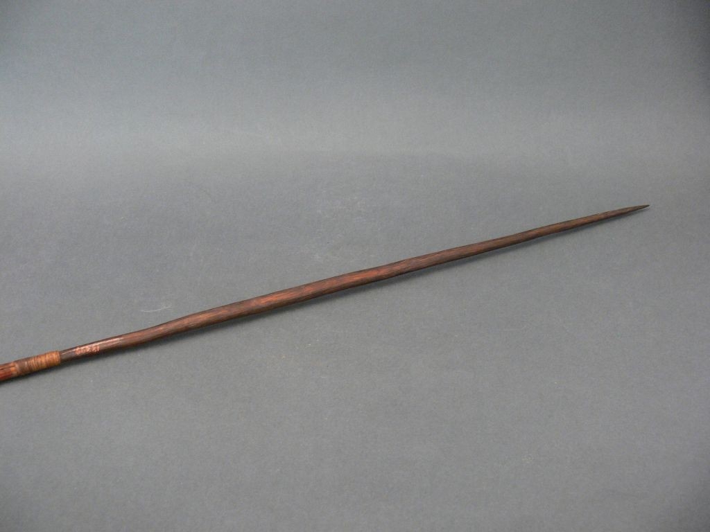 Kétrészes nyílvessző. A bambuszból metszett szárba növényi rostzsineggel rögzítették a fából faragott, kerek keresztmetszetű hegyet. A szár csomóinak környékét égetéssel díszítették.