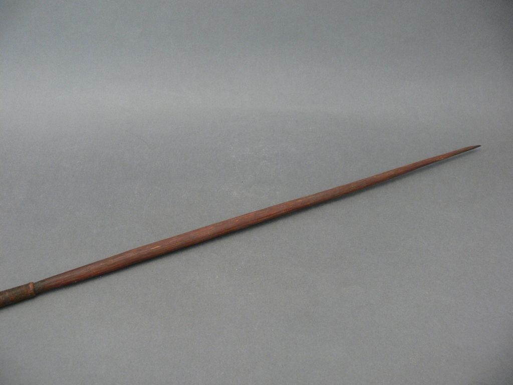 Kétrészes nyílvessző. A bambuszból metszett szárba növényi rostzsineggel rögzítették a fából faragott, kerek keresztmetszetű hegyet.