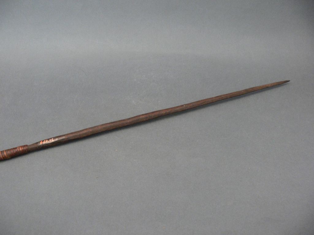 Kétrészes nyílvessző. A bambuszból metszett szárba növényi rosttal rögzítették a keményfából faragott, kerek keresztmetszetű hegyet.