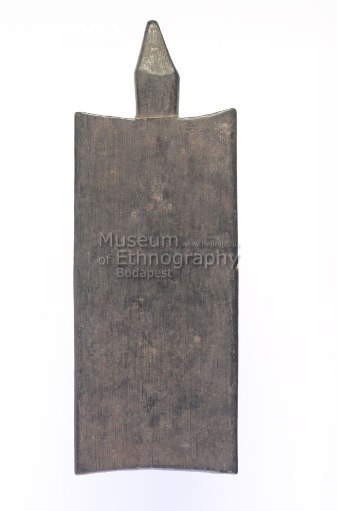 Barna falapból faragott eszköz (måt, tami). Markolatként szolgáló részét elnyújtott téglalap formában alakították ki. Ennek egyik végéhez csatlakozik a hálószem megcsomózására szolgáló ötszög alakú, közepén kissé megtört rész, ami kidolgozásában stilizált madárfejre emlékeztet. Ennek végébe lyukat fúrtak.