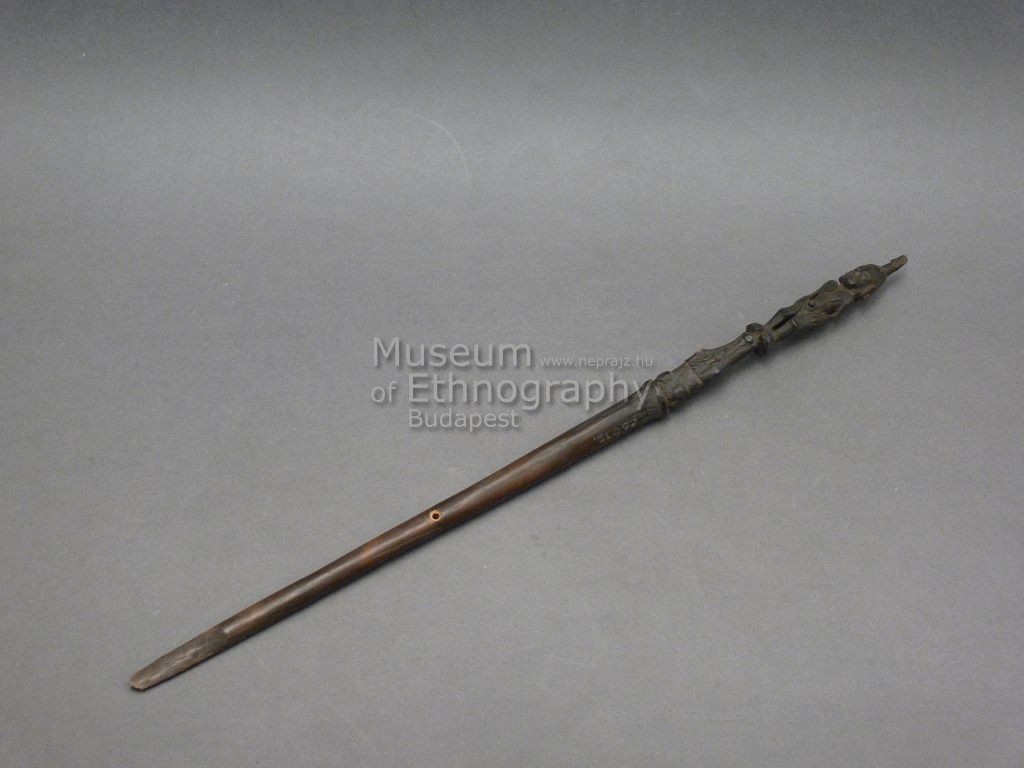 Sötétbarna keményfából faragott mészpálca. Egyik végén ellaposodó, nyélrészén krokodilfejet és a krokodil orrán álló emberalakot ábrázol.