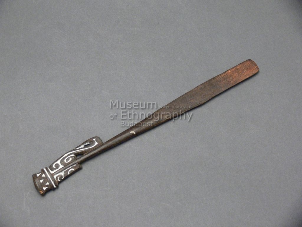 Kemény faanyagból faragott, sötétbarnás színű, hosszúkás, lapos, alul lapátszerűen kiszélesedő tárgy, felső részén kiemelkedő, egyik oldalán törött, összefonódó kérdőjeles és hullámvonal ornamentikával.