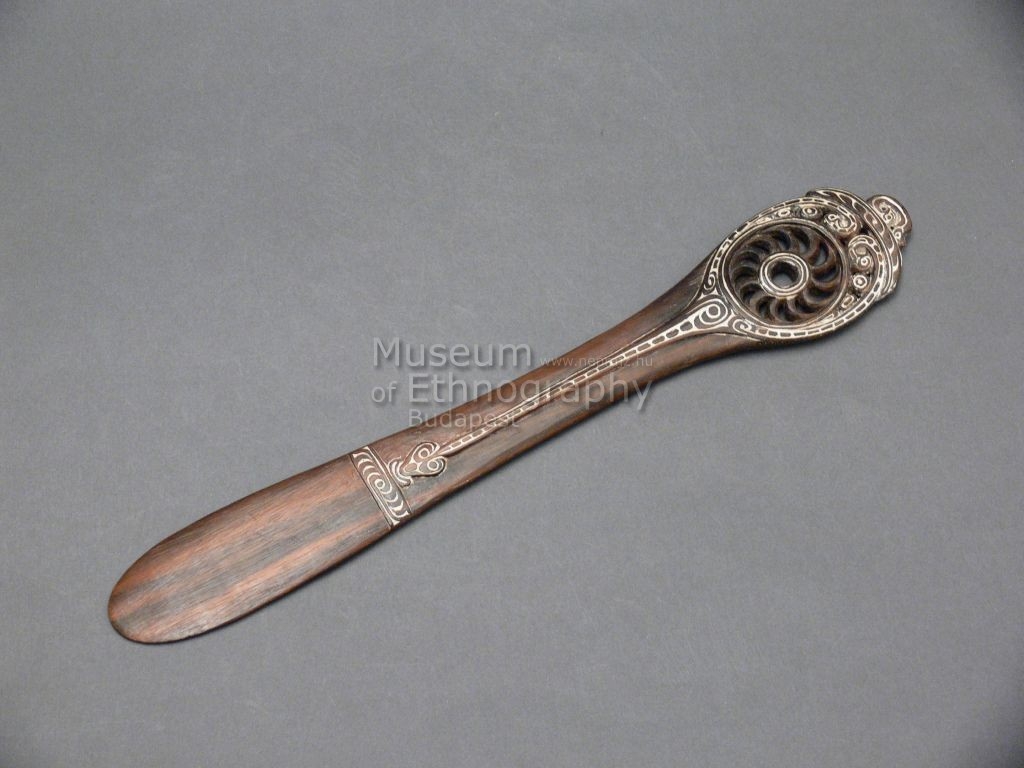 Barnás színű fából faragott, hosszúkás késhez hasonló. Fogó részén áttört díszítéssel, egy díszítéssor a lapátka hosszában kb. 3/4-ig végigvonul mind a két oldalon. Az ornamentika magas reliefes, ezen belül vésett vonalakkal. A mélyített részek mészporral festettek.