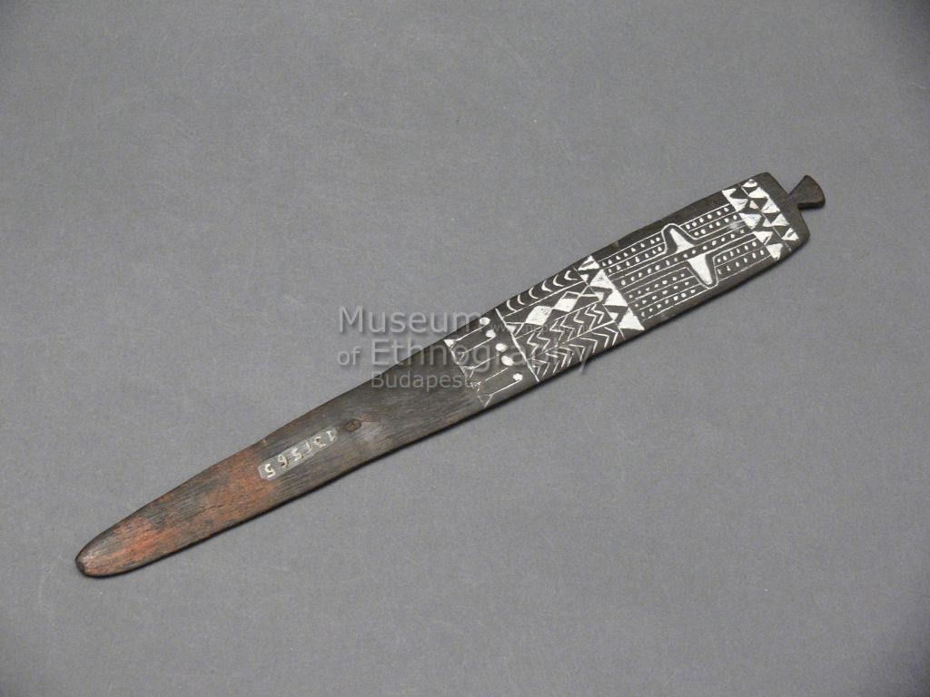 Fából faragott, hosszúkás, téglalap alakú, alul elkeskenyedő tárgy. Felső része nagyjából feléig vésett, vonalas és pontsorokból álló ornamentikával, mészporral inkrusztálva. Felső végén háromszöges nyúlvány.