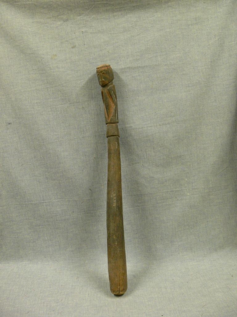 Fából faragott, barna, enyhén hajlott tárgy. Alsó vége felé megvastagodik, felső végén, fogóján emberalak törzse feje és karjai vannak kifaragva. A fogórész helyenként vörössel színezett.