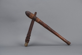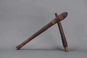 Nyele barnás színű, hengeres, felső vége felé bunkószerűen megvastagodó. Felső része repedt, a repedést spanyolnádcsíkokból fonott gyűrűk tartják össze. Alsó részét fonott gyűrű díszíti, ott, ahol a megvastagodás kezdődik, öt mélyített, körbefutó vonal díszíti. Megvastagodó részén kerek nyílás vezet keresztül. Ebbe a nyílásba van beledugva a kőtartó foglalat, mely két, végén csúcsban összefutó fapofából áll. A két fapofát egymással spanyolnádgyűrűk erősítik össze. A törőkő szürkés színű, hengeres, egyenesen levágott, befelé öblösödő.