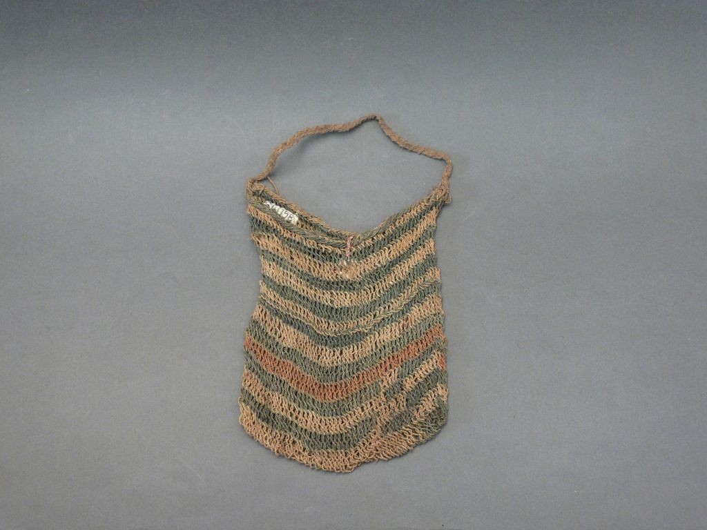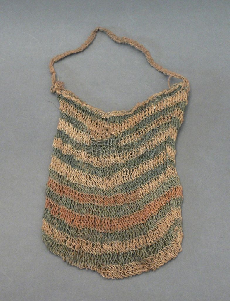 Növényrostokból, hurkolt technikával készített, egy hosszú fülű táska, melynek mindkét oldalát világosbarna és kopott fekete csíkok díszítik, egy helyen vöröses csíkkal.