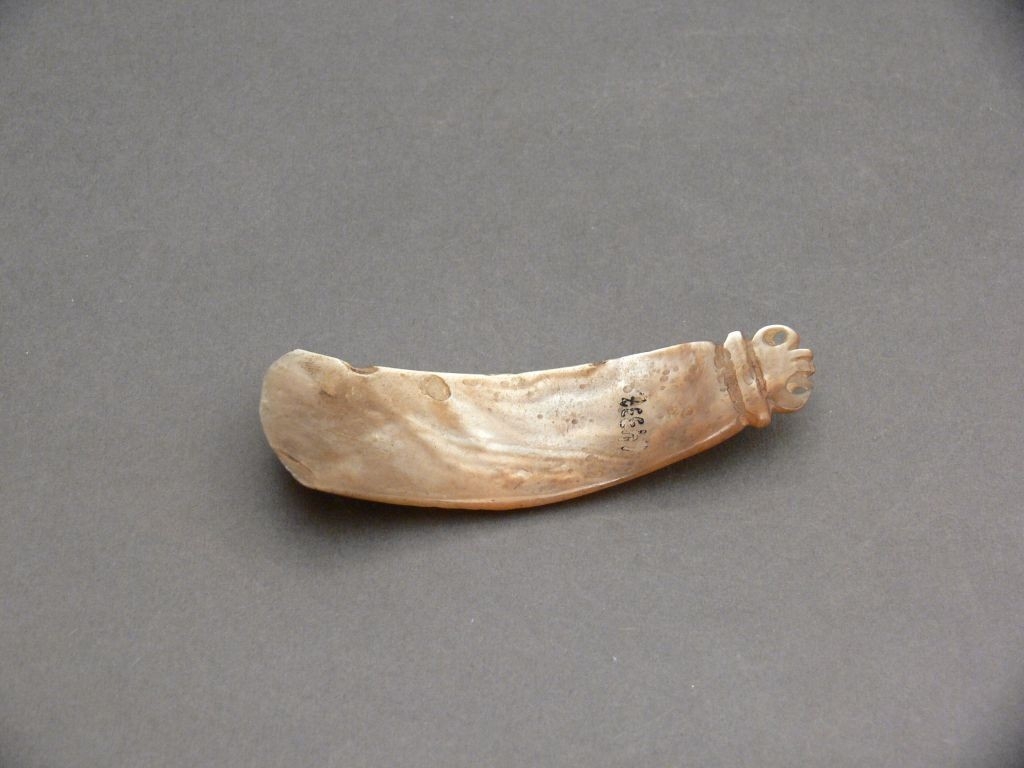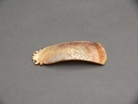 Téglalap alakú, enyhén hajló, mindkét oldalán fényes, egyik keskenyebbik élén, két helyen átfúrt és faragással díszített gyöngyházlap. Bíró-jegyzet: 757.