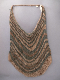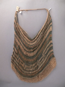 Növényrostokból, hurkolt technikával készített, szatyoralakú, egyfülű tárgy, amelyet mindkét oldalon keskeny nyers, fakó kékes és néhány barnás sáv díszít. Bíró-jegyzet: 509. Rákötött textilaszalagon Biró jegyzet abelun aszala (j) anyagja: szelen