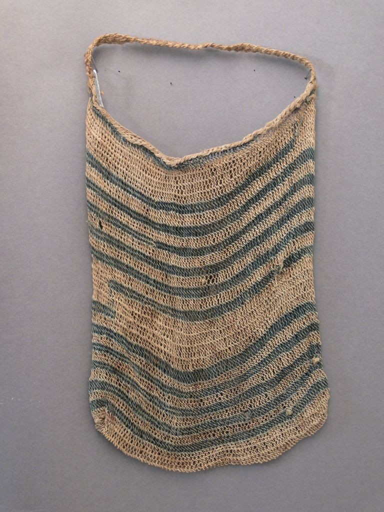 Növényrostokból, hurkolt technikával készített, nyers színű, szatyoralakú, egyfülű tárgy, amelyet mindkét oldalon keskeny kékes sávok díszítenek a világossal váltva. Bíró-jegyzet: 509.
