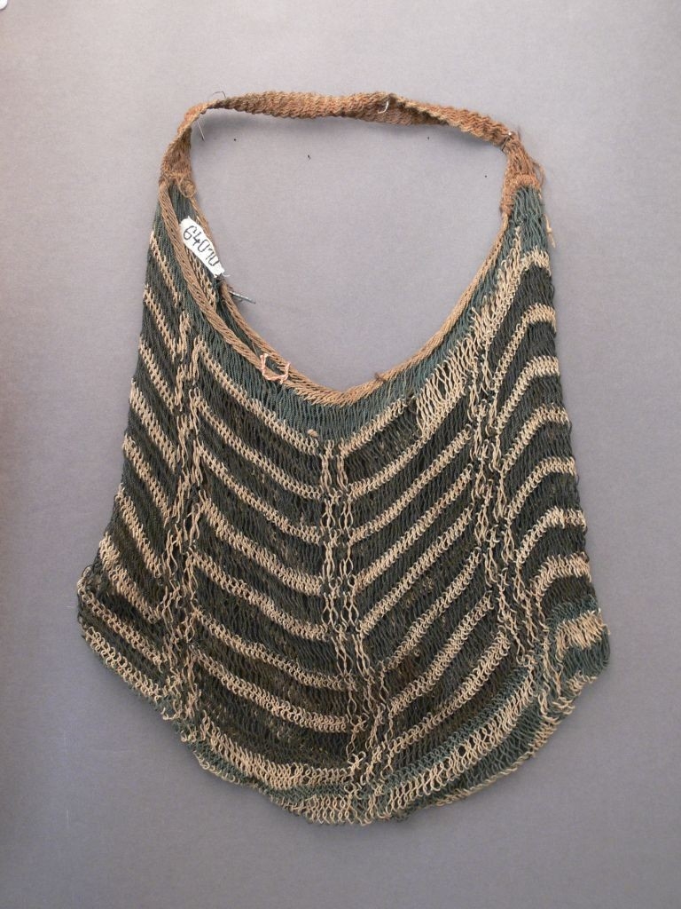 Növényrostokból készített, hurkolt technikájú, sávokban elhelyezkedően fekete és nyers színű szatyoralakú tárgy, egyfülű. Bíró-jegyzet: 509.