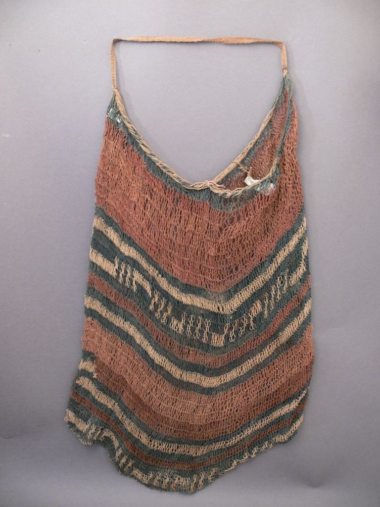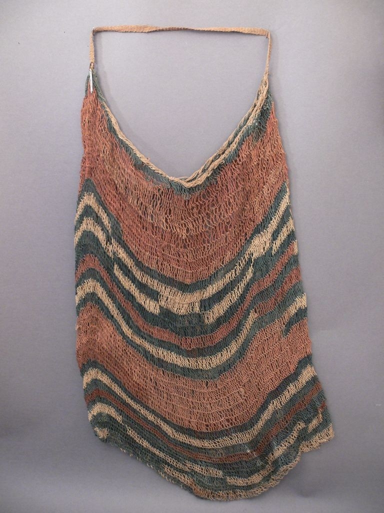 Növényrostokból, hurkolt technikával készített, sávosan vöröses, feketés és nyers színű, szatyoralakú, egyfülű tárgy. A két világos vöröses sáv szélesebb, a többi felületet fekete és fehér keskenyebb sávok töltik ki.