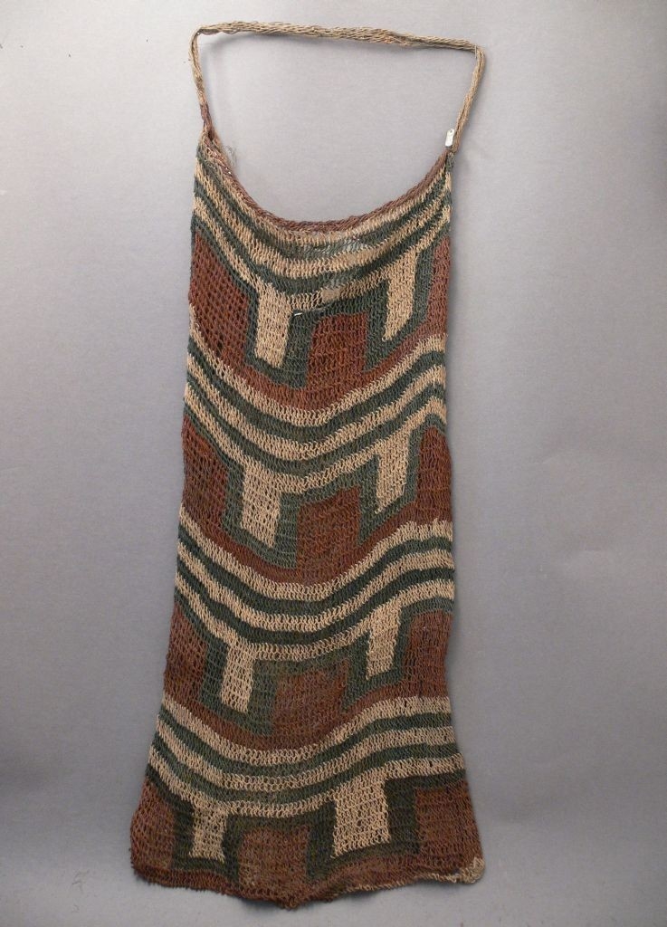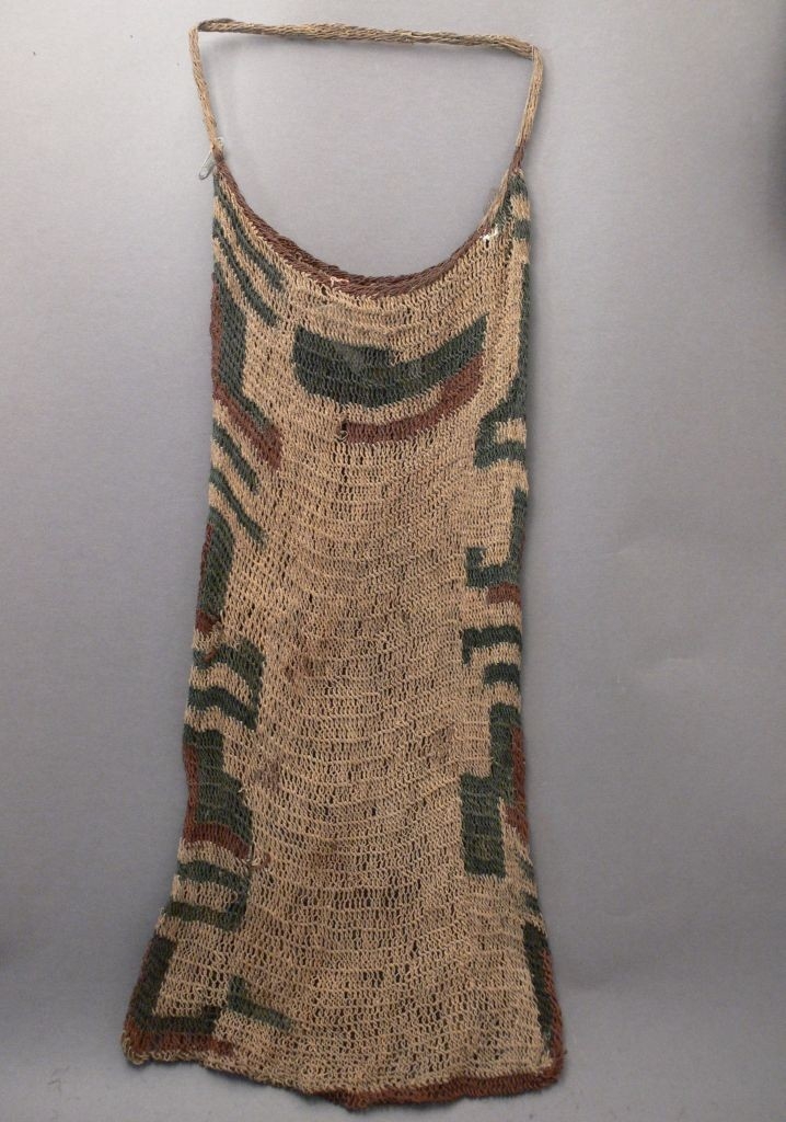 Növényrostokból, hurkolt technikával készített, szatyoralakú, egyfülű, nyers színű tárgy, amelyek egyik oldalon fakult kékes, barnás-vöröses és nyers színű minták díszítenek. Egyik oldalán a nyers szín dominál, másikon a vöröses. Bíró-jegyzet: 510/l.