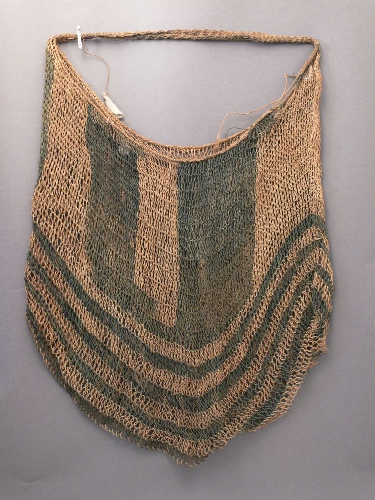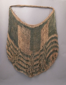 Növényrostokból készített, hurkolt technikájú, aszimmetrikus foltokban és sávokban nyers-és kékes színű, szatyoralakú, egyfülű tárgy. Bíró-jegyzet: 510.