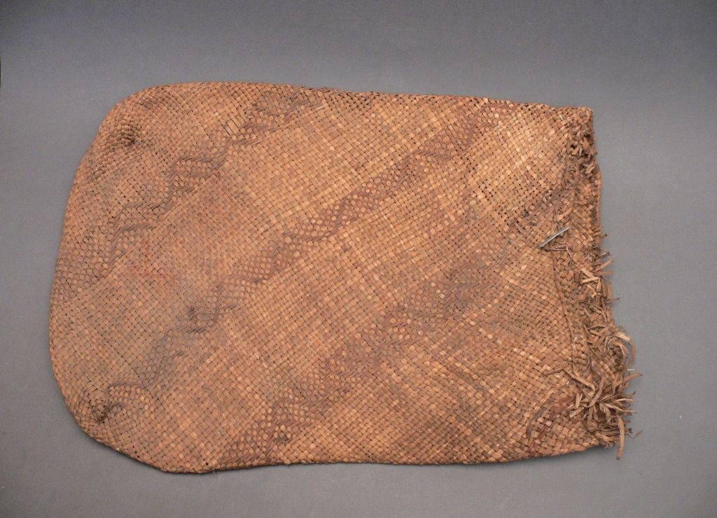 Levélfonat szatyor. Átlós szálfutás, vászonkötés, alja kerek szája szegett, rojtozott. Natúr sárga alapon keresztbe barna sávok, amiben geometrikus minták vannak szőve.