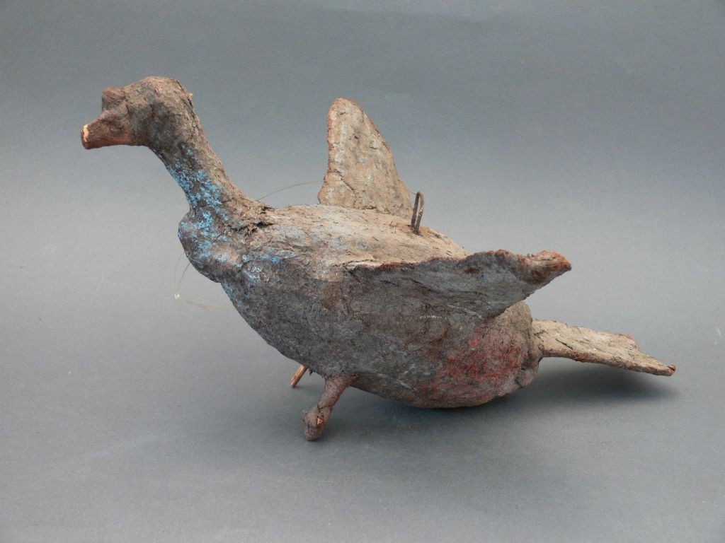 Madárszobor. Növényi rostból készült, szürke anyaggal bevont, eredetileg kékre festett üreges tárgy.