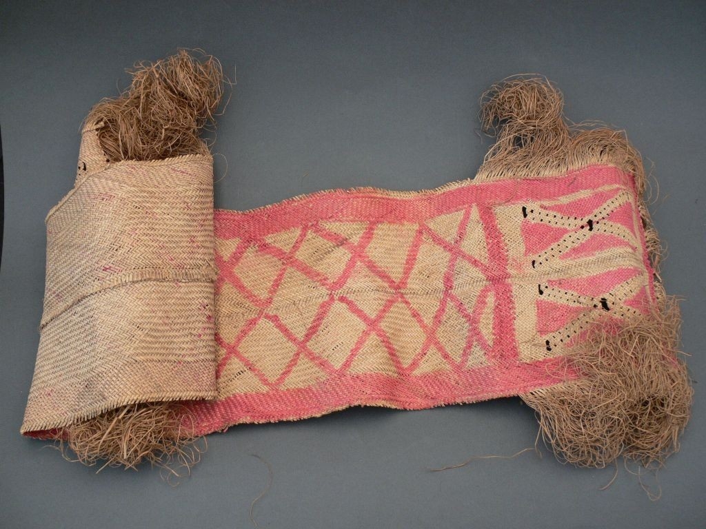 Festett ágyékkötő. Növényi rostból szőtt csík, melynek végein szabadon hagyták az anyagaként használt növényi rostot. Egyik oldalára rózsaszínű geometrikus motívumokat festettek.