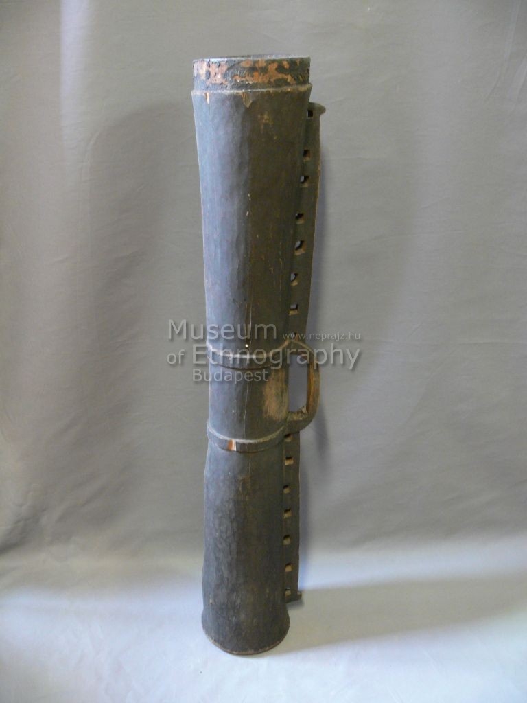 Egy darab fából faragott, csaknem feketés színű, hengeres, belül kivájt tárgy. Oldalán gerinc fut végig, középen fogószerűen kiképezve tizenöt négyszögletes lyukkal. Középrészén a fogó két végéből két perem fut körbe a dob derekán. Felső nyílása körül mélyített perem van, aszfaltszerű anyaggal.