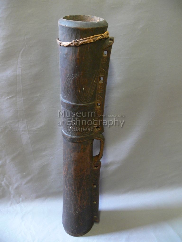 Egy darab fából faragott, sötétbarnás színű, hengeres alakú, belül kivájt tárgy. Oldalán csaknem teljes hosszában gerinc fut végig, középen fogószerű kivágással, nyolc négyszögletes lyukkal. Alsó felében két perem által határolt térben hullámvonalakból álló díszítés, az alsó perem alatti részén ugyanez ismétlődik. Alul repedt, a repedés rotangkötelék tartja össze. A gerincet félkör alakú vonalak díszítik. Felső nyílása körül mélyített perem van, fekete, aszfaltszerű anyag nyomaival. Bőr hiányzik