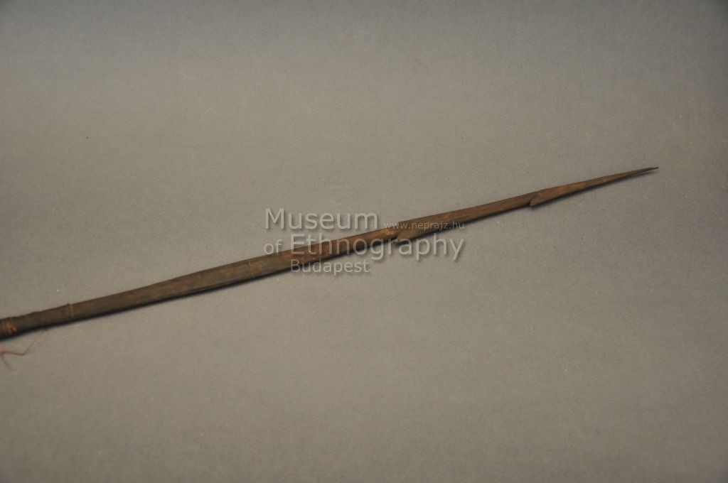 Kétrészes nyílvessző. A bambuszból készült szárba növényi rosttal rögzített, trapéz keresztmetszetű keményfa hegyet illesztettek, melybe szakákat faragtak.