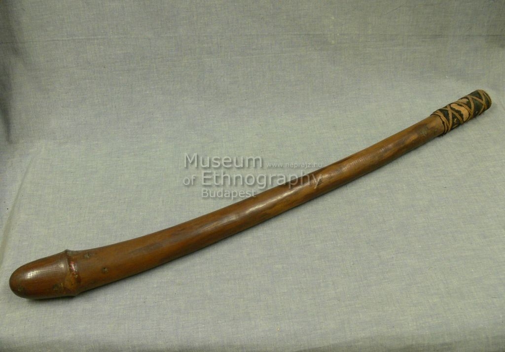 Keményfából faragott, barnás színű, hengeres, ütőrészén megvastagodó és körbefutó gerinccel ellátott, fogórészén kókuszdiórost-fonattal körültekert textíliával felszerelt tárgy.