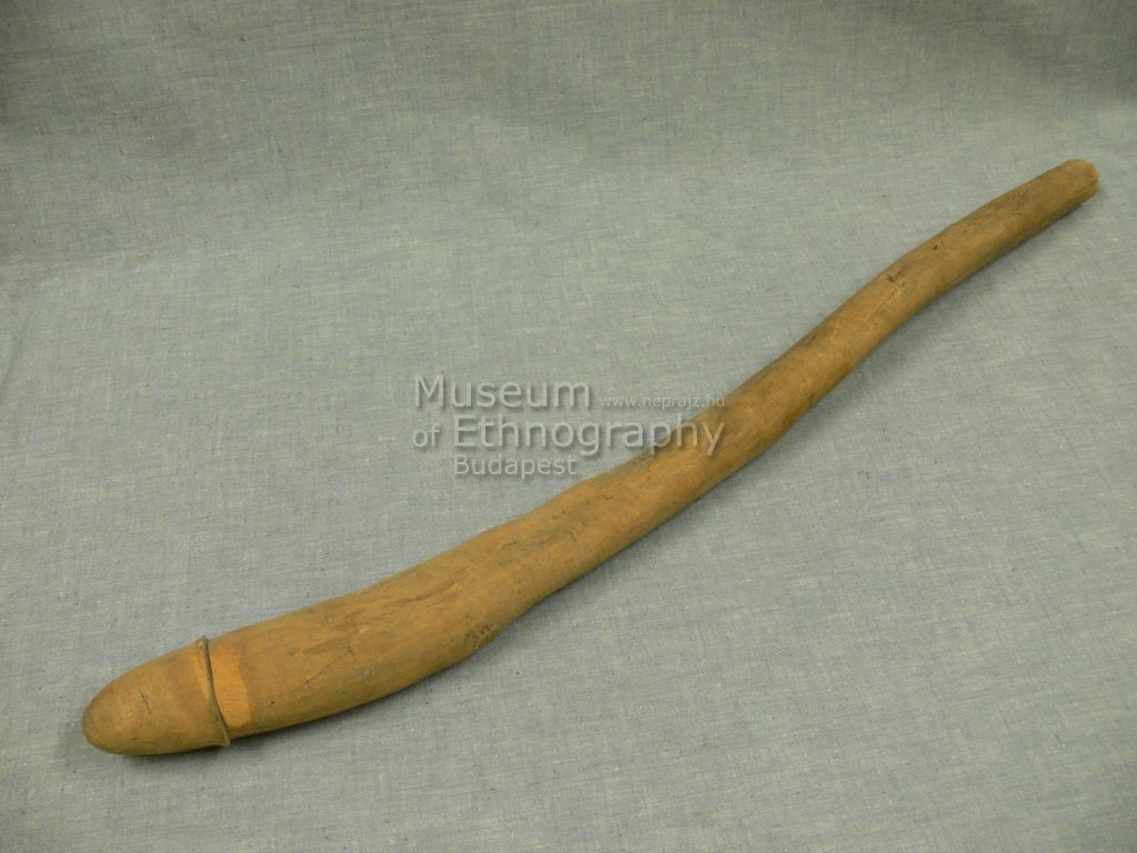 Keményfából faragott, világos színű, hengeres, ütővégén megvastagodó és peremes kiugrással ellátott tárgy. Díszítetlen.