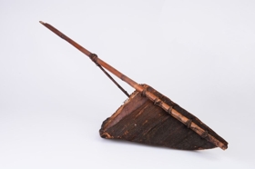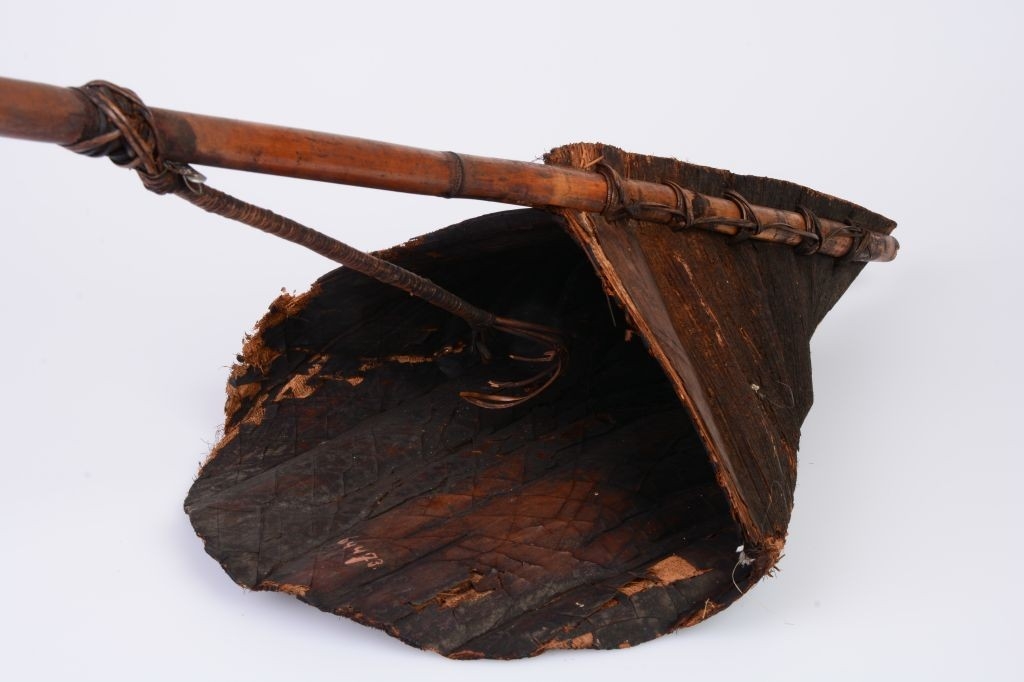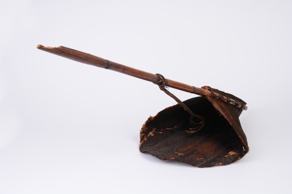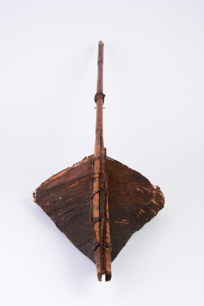 Fakéregből kialakított zsák szerű tartó. Alja nagyobb háromszög alakú kéreg, kér felső része kisebb, háromszög alakú. Felülről kapcsolódik hozzá egy sötétbarna bambuszrúd. Hosszában kettéhasított két fele közé, majd rotanggyűrűkkel egymáshoz erősítették őket. A nyél középső részéhez egy gyűrűben végződő rotangnád fonadékot rögzítettek.