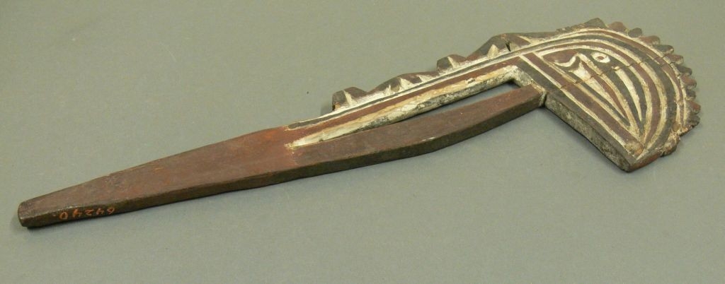 Egy darab puhafából faragott, hosszú nyéllel és erősen stilizált fejrésszel ellátott tárgy. Ez utóbbin bemélyített és fehér festékkel kitöltött vonalakkal madárfejet alakítottak ki, amelynek egymást váltó sávjait feketére és sötétvörösre festették. Hasonló technikát alkalmaztak a tárgy áttört nyelénél is. Bíró Lajos szerint a fej sast (mboán) ábrázol.
