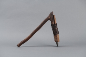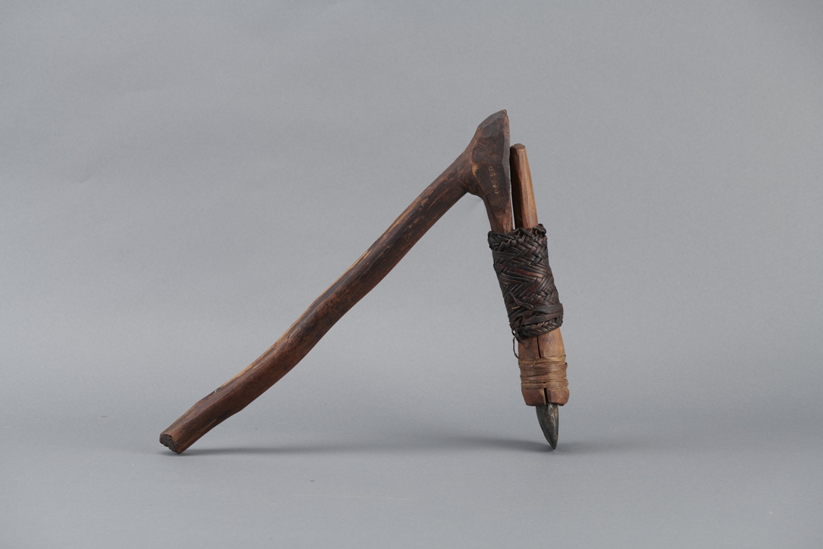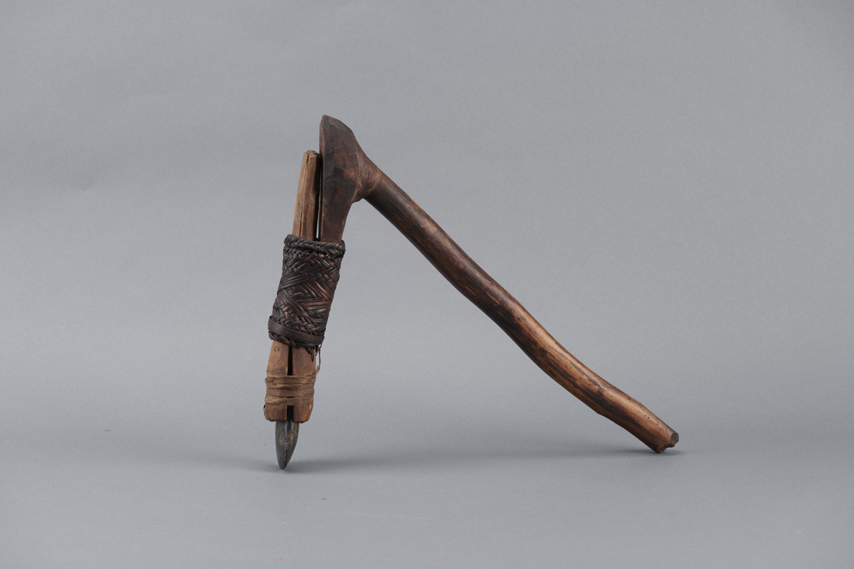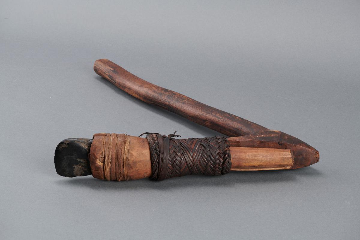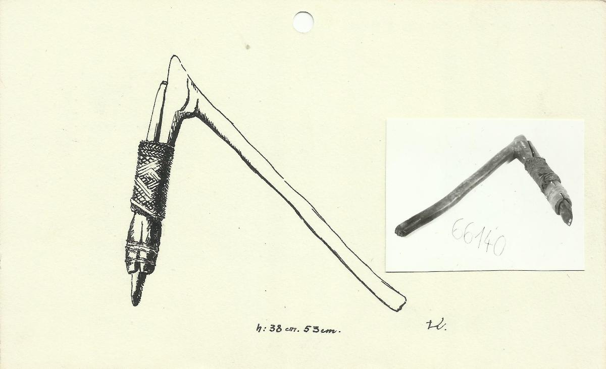 Nyele sötétbarna színű, keményfából faragott, térdalakúan hajlott. Fogója hengeres, a pengefoglalat felerősítésére szolgáló rész lapos, vége felé keskenyedő, szögletes. Díszítetlen. A zöldes színű élezett kőpenge két fokozatosan keskenyedő fapofa közé van beszorítva; a két fapofát barnás színű háncs erősíti össze. A pengefoglalatot sötétbarna színű, spanyolnád csíkokból fonott gyűrű erősíti a nyélhez. A kőpenge ellaposodóra van csiszolva, és a nyélre merőlegesen van rögzítve