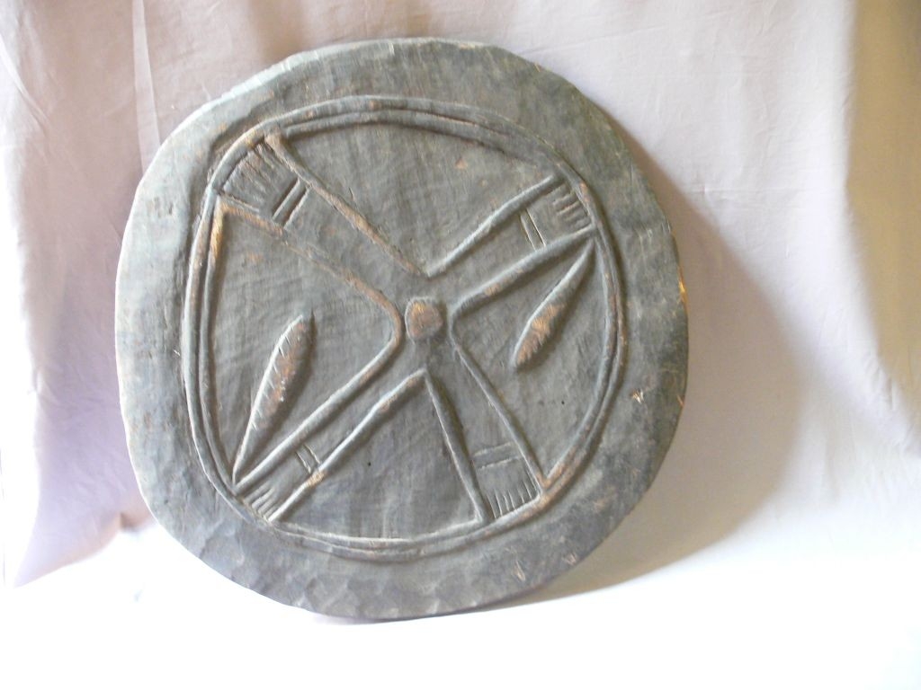 Korong alakú, vastag, nehéz faanyagból faragott lap. Külső oldalán körben perem húzódik, ezen belül X alakú motívum van, közepén kiemelkedő, kör alakú faragással. belső oldalán két párhuzamosan futó, kiemelkedően faragott, átfúrt fül van, a lyukakon rostfonat van áthúzva. A pajzs alapszíne sötétbarna.
