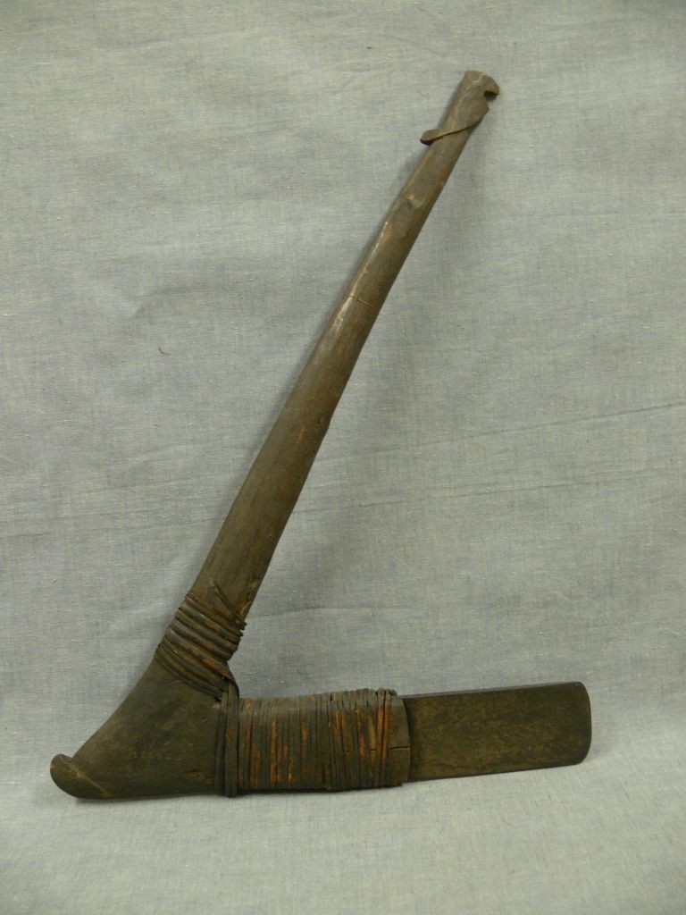 Fából faragott, lapos, felső részén 30 fokban hajló tárgy. Felső része hasított, ide van illesztve a gyaluvasból készült penge amit növényi rost rögzít. A nyél végén stilizált, elnagyolt madáralak. Háncs meglazult