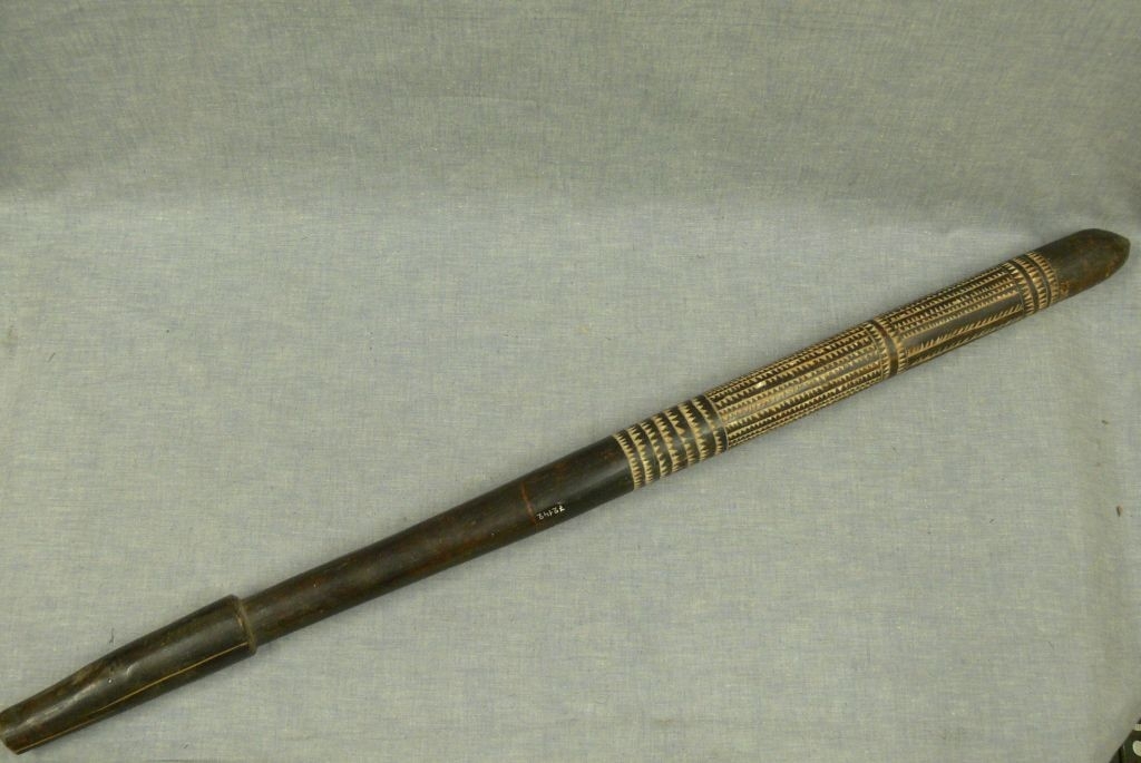 Sötétbarna színű keményfából készült, a nyél enyhén szabálytalan keresztmetszetű. A markolat vége enyhén elvékonyodó (csonkakúp-szerű), egyenes. Az enyhén vastagodó nyél legvége ellipszoid ('kupolás') alakú. A nyél egy részén körbefutó vésett, díszített szakasz következik. A díszítés három részre tagolt, alul, felül 'farkasfog' mintás körgyűrűk határolják, és a díszített szakasz közepén is egy 'farkasfog' mintás körgyűrű található. A körgyűrűk által közrefogott két körsáv díszítése függőleges irányú, 'farkasfog' mintás sávokból áll. A súly 1,184 kg.