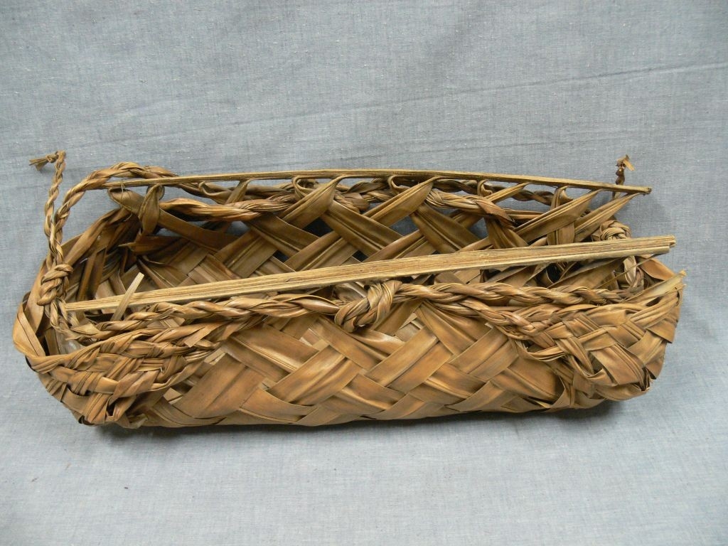 Széles, eléggé merev, barnás színű, növényi levélből durván fonott, hosszúkás, tégla alakú kosár, nyílásánál kétoldalt puha famerevítővel.