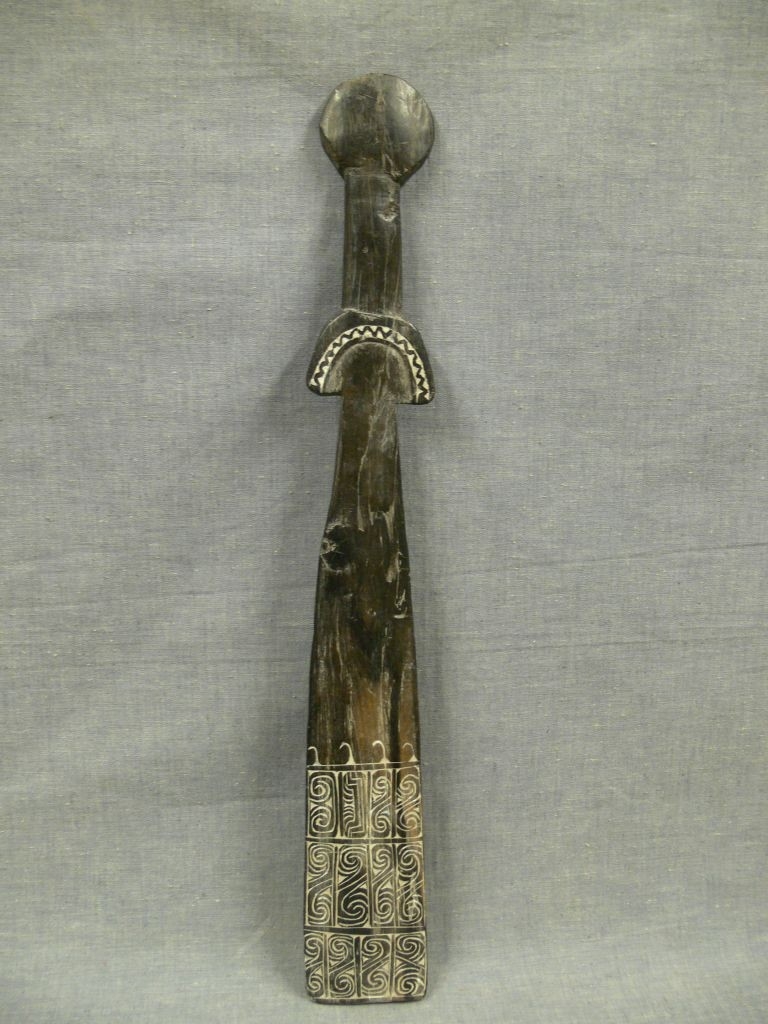 Kemény faanyagból faragott, feketés színű, lapos, kardszerű tárgy, lapjának alsó részén mindkét oldalon sávokban elrendezett, vésett, összefonódó kérdőjeles és vonalas, mészporral fehérített ornamentikával. Markolatának alsó részén mindkét oldalon vésett hullámvonal.