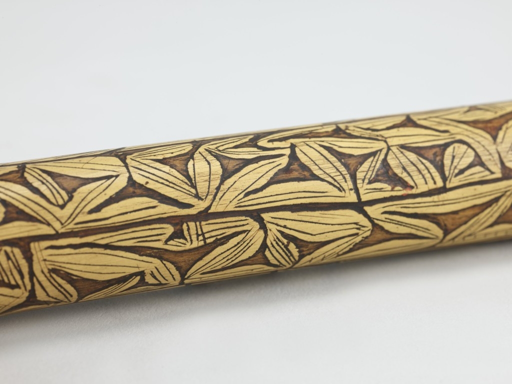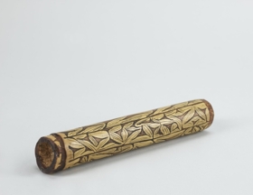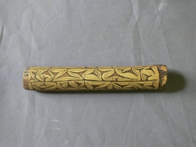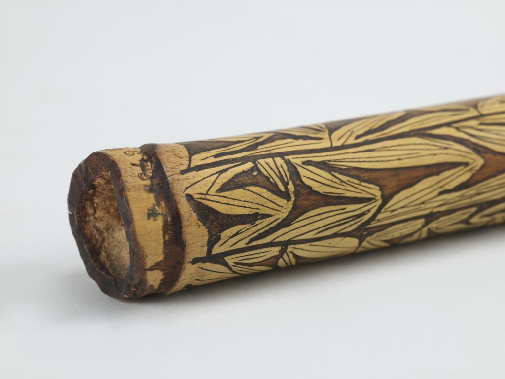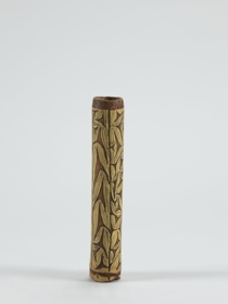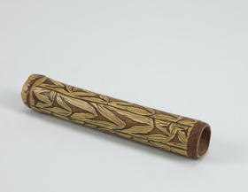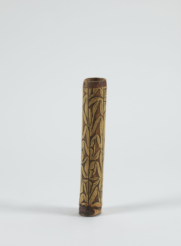Sárgás-barnás színű, hengeres bambuszcső. Alsó végét a bambusz nódusa képezi, felül nyitott. Felületét karcolt és vájt, váltakozva sötétbarna és sárgás színű geometrikus díszítés borítja.