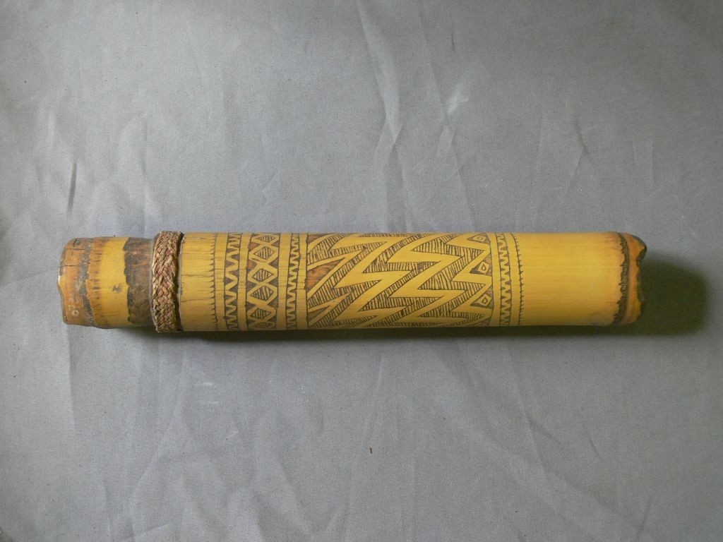 Hengeres alakú, sárgás-barnás színű tárgy. Alját a bambusz nódusa képezi, felső részét bambuszból készített dugó zárja el. Felülete körben, széles sávban karcolt geometrikus motívumokkal van díszítve, a karcolt, ill. helyenként lehántott részek elütő barnás színűek. Nyílása alatt világosbarna rostfonat fut körbe.