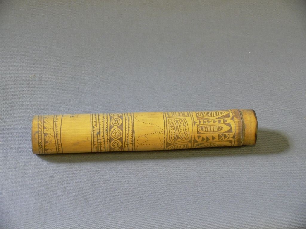 Sárgás-barnás színű, hengeres bambuszcső. Alsó végét a bambusz nódusa képezi, felül nyitott. Díszítése három helyen szalagszerűen körbefutó, karcolt és vájt, sávokban elrendezett geometrikus motívumokból áll.
