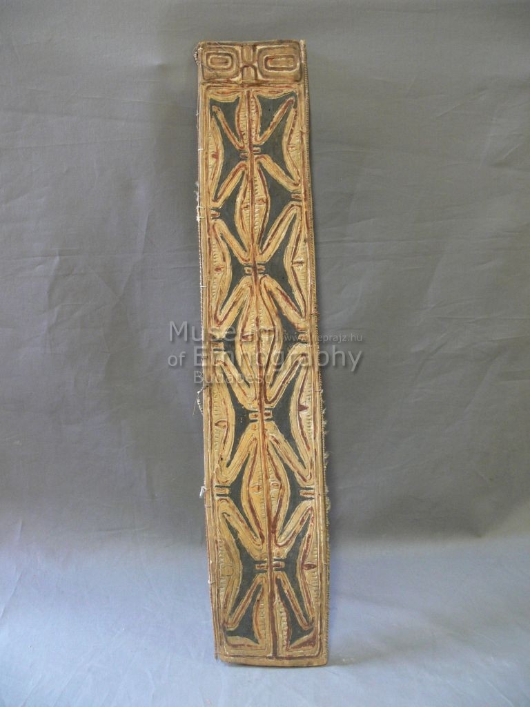 Téglalap alakú, könnyű faanyagból faragott vékony lap. Külső oldalát faragott és festett geometrikus motívumok fedik, a színezés fekete, vörös, fehér és a fa természetes színe. Egyik hosszanti oldalára vékony csík van varrással rögzítve két helyütt, a másik oldalon kis csigafüzérek. Belső oldalán hosszanti irányba futó, kiemelkedő, átfúrt fogó van. Színe ezen az oldalon a fa természetes világos színe.