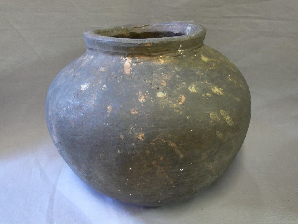 Szürkére égetett agyagból készült, kúpos aljú hasas fazék. Nyakrészén pontsoros díszítés.
