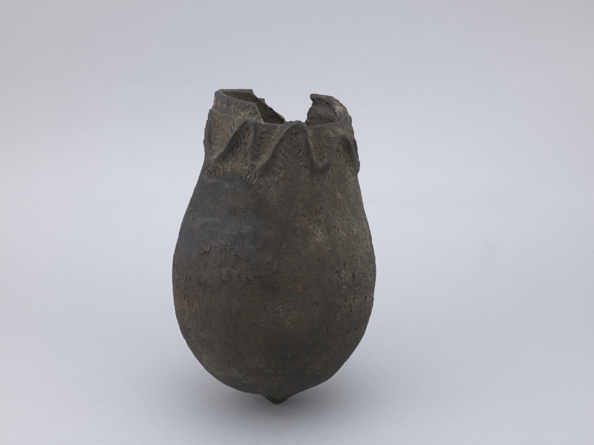 Szürkére égetett agyagból, spirális technikával készült edény, kívül a használattól sötétszürkére koromnyomokkal. Az edény teste tojás alakú, szájpereme egyenes. Pereme alatt kb. 2 cm szélességben hullámvonalakból álló plasztikus dísz található. A hullámvonalakon mindkét oldalon apró bevagdalások láthatók.