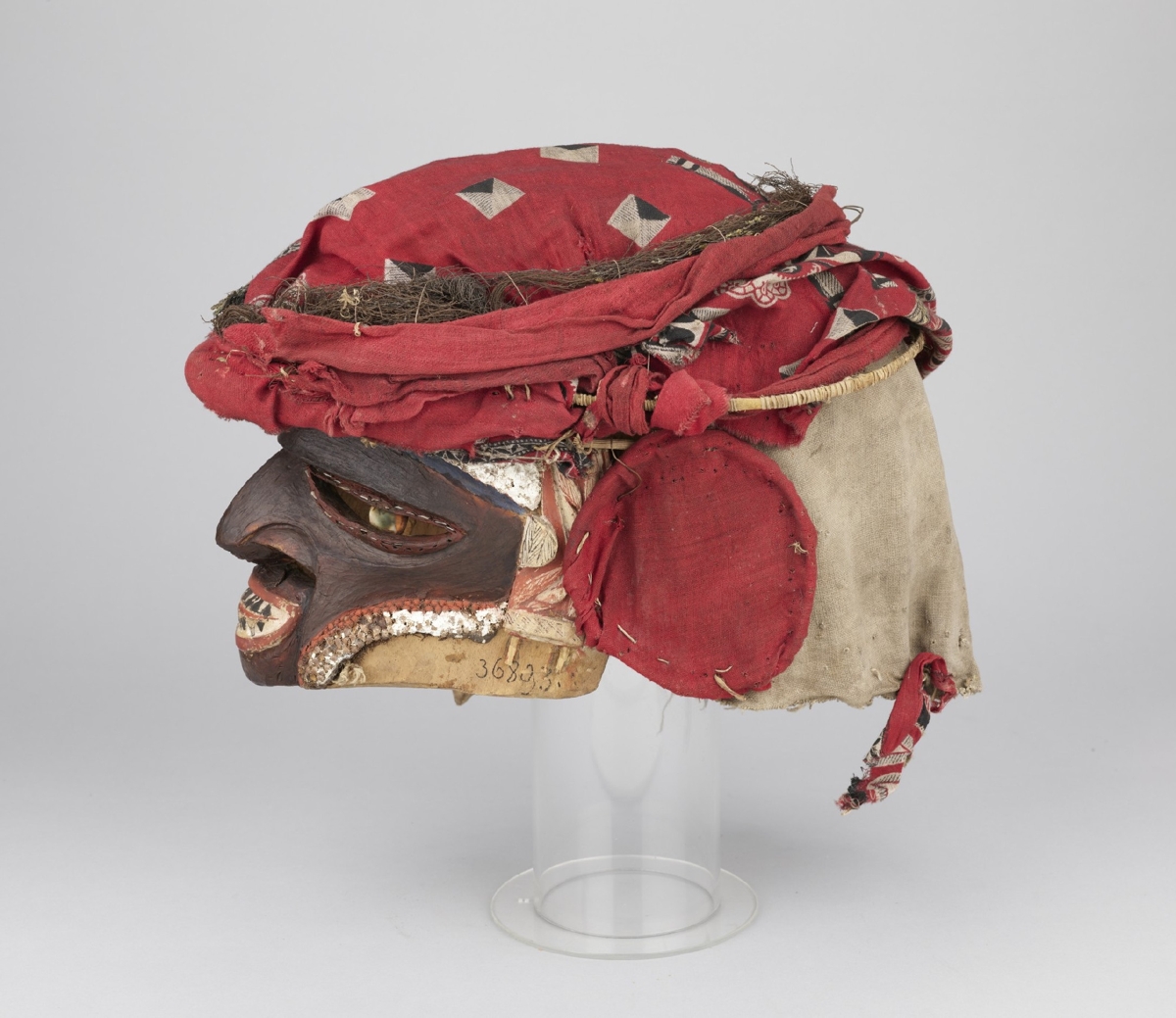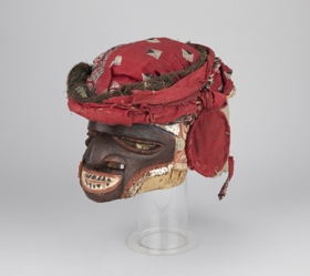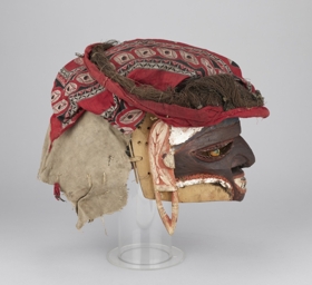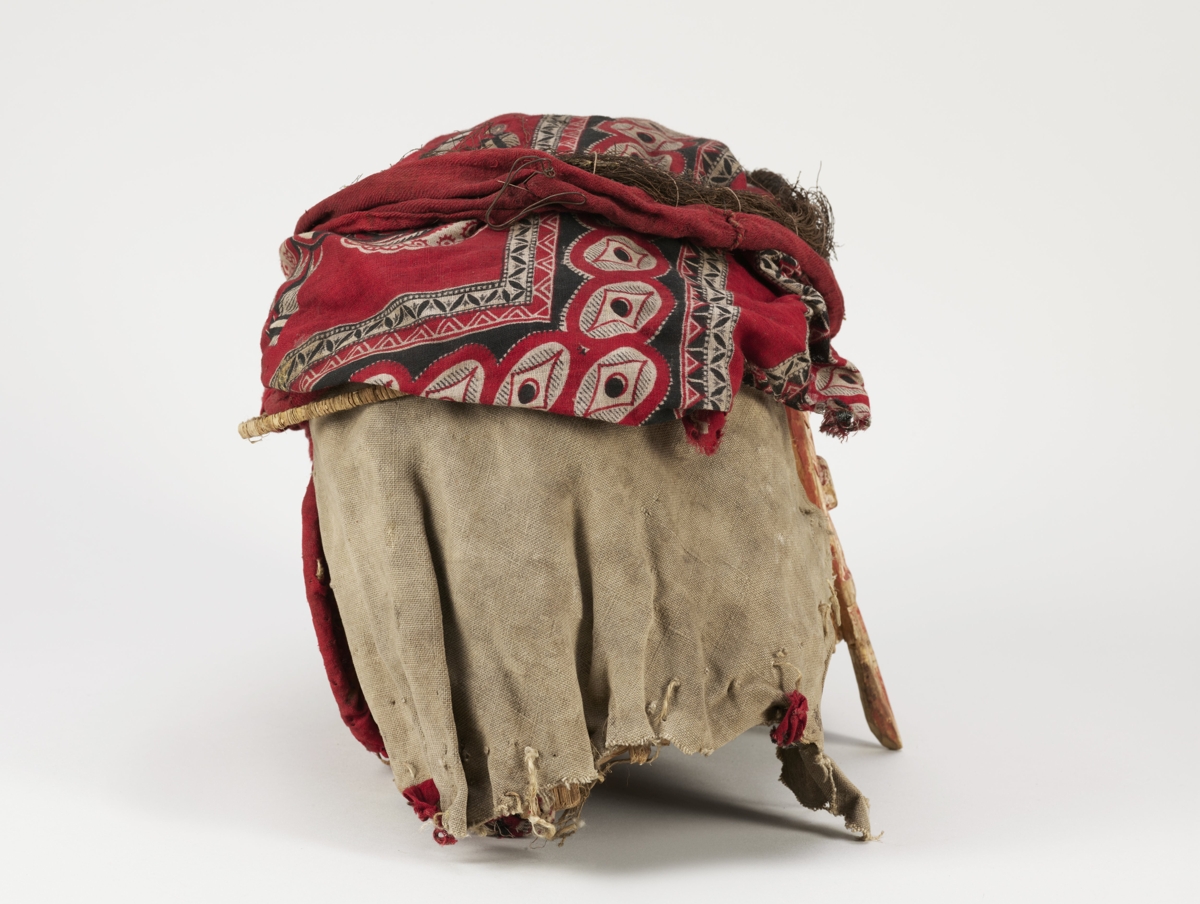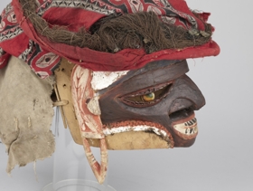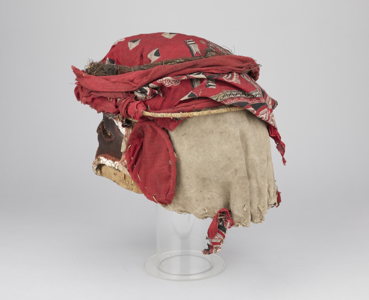 Arcrésze puha faanyagból faragott, antropomorf. A szemeket áttört fél oválisok jelzik, középütt a szemgolyót jelző egy-egy zöldes turbócsiga. Az orrnál két áttörés, a száj zárt. A fogakat váltakozó fekete-fehér háromszögek jelzik. Kétoldalt fülfaragvány. Az arc feketére festett, homlokrészénél fehér, oldalt vöröses színezésű. A fejrész spanyolnád vázra erősített vörös és mintás textilből készült.