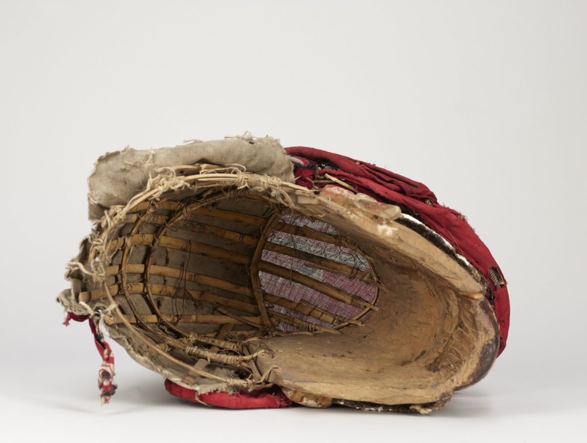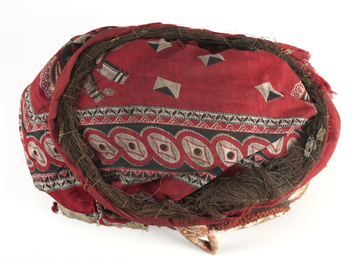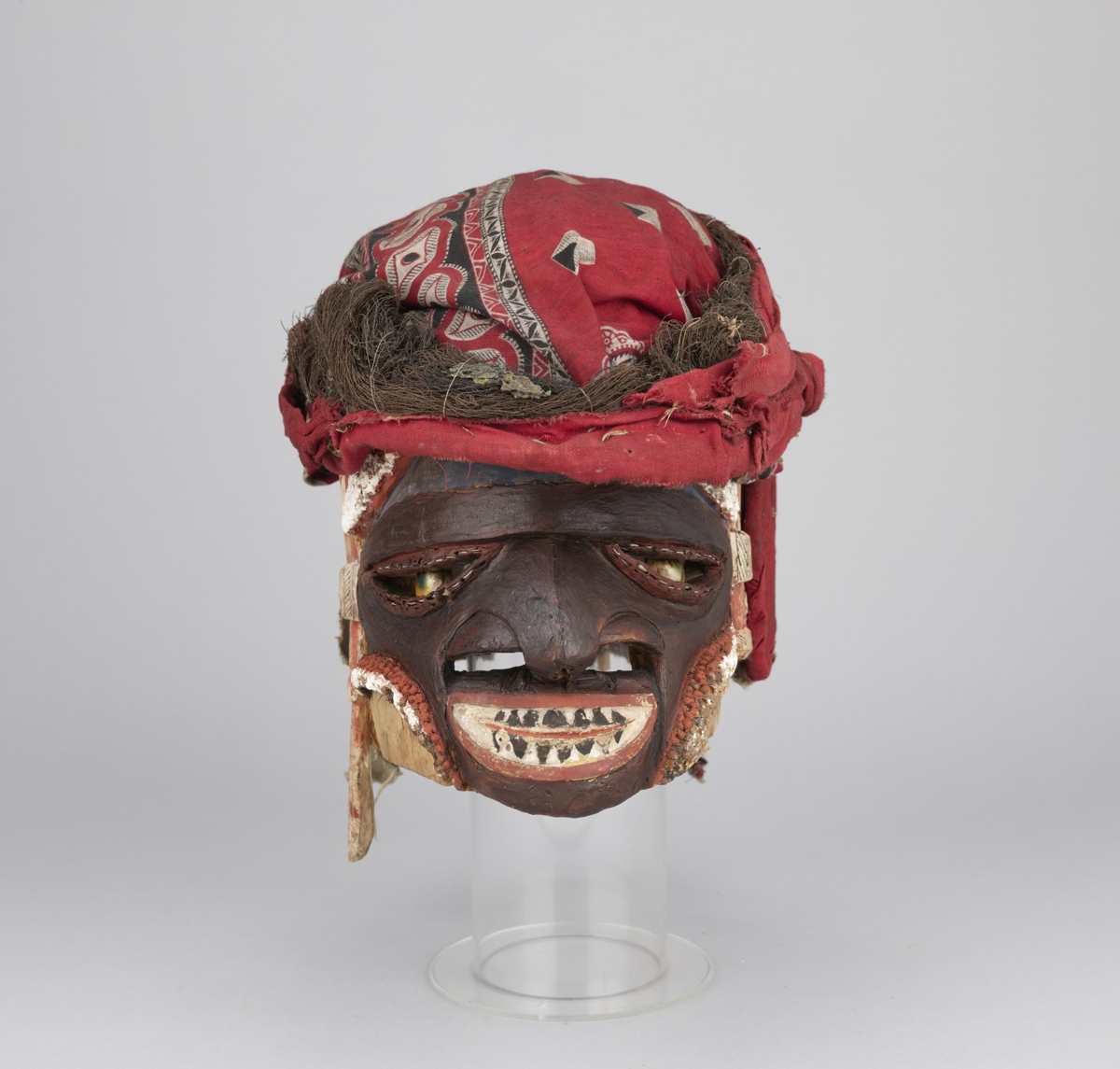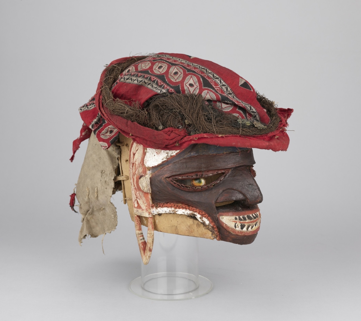 Arcrésze puha faanyagból faragott, antropomorf. A szemeket áttört fél oválisok jelzik, középütt a szemgolyót jelző egy-egy zöldes turbócsiga. Az orrnál két áttörés, a száj zárt. A fogakat váltakozó fekete-fehér háromszögek jelzik. Kétoldalt fülfaragvány. Az arc feketére festett, homlokrészénél fehér, oldalt vöröses színezésű. A fejrész spanyolnád vázra erősített vörös és mintás textilből készült.