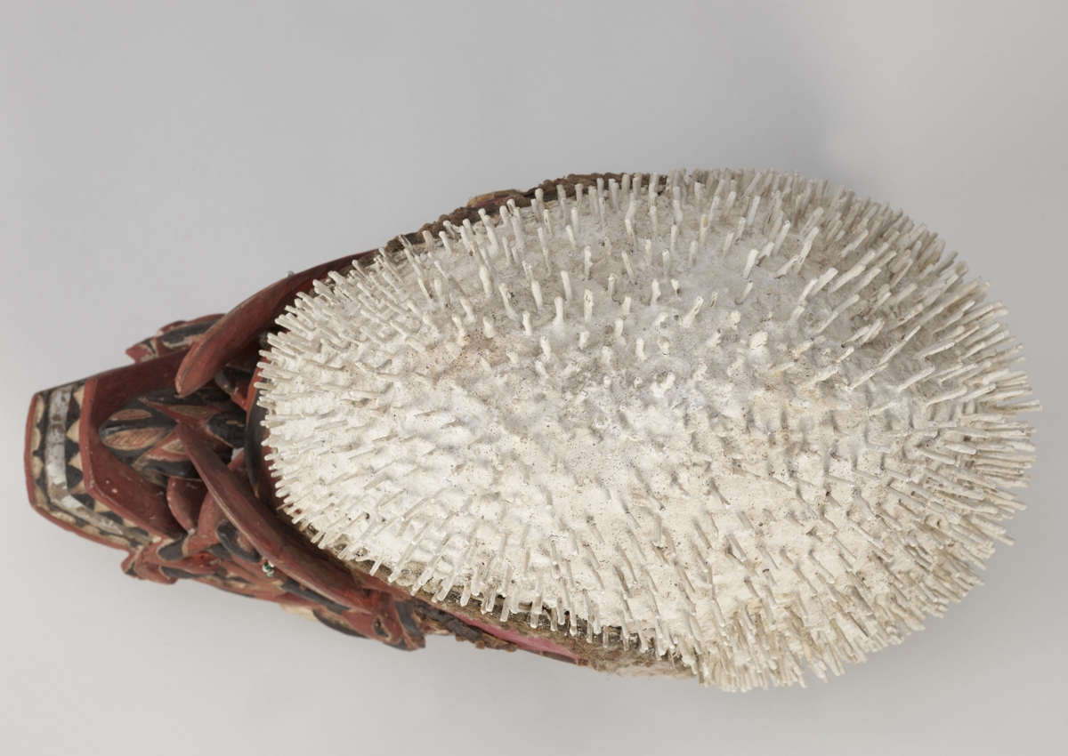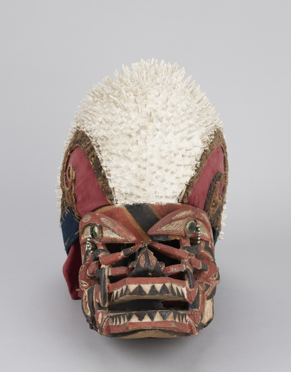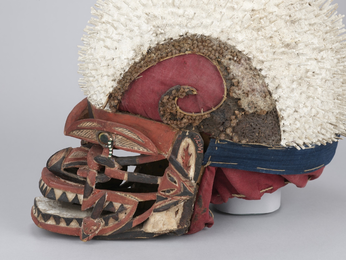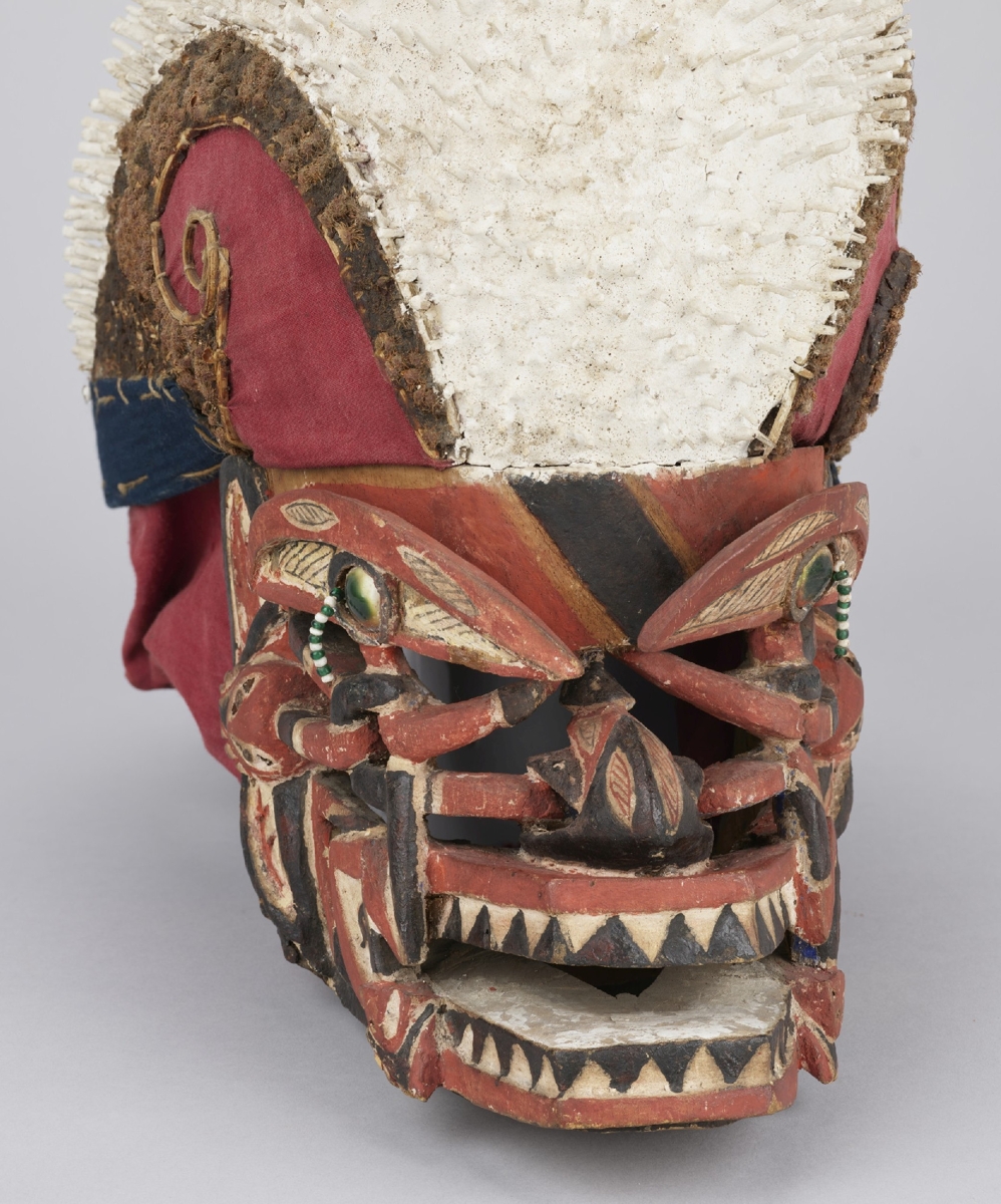 Arcrésze puha faanyagból áttörten faragott. Előreugró szája nyitott, a fogakat háromszög alakú, váltakozóan fekete és fehér színű festés jelzi. Két oldalt madárfej faragvány van, ezekből indul ki az áttörten faragott arcrész változatos díszítése. Az orr nyomott, áttört. A homlok előtt kiugróan faragott szemöldök van, az egyiken középen lelapított, gömb alakú, zöldes színű kőzet jelzi a szemet, a másikon csak a szemgödör látszik. Az arc díszítése vörös, fehér, fekete festékből, valamint feketével rovátkolt motívumokból adódik. Az arcrészhez kötözéssel van felerősítve a fejrész, mely rotang vázra erősített, barnás színű faháncs anyagból készült. Kívül a fejrész fehér festéssel van díszítve, az alapból pedig sündisznószerűen kis fadarabkák állnak ki. A homlok fölötti része, vörös textil anyagból van, ugyanilyen anyag van a fej hátsó peremére erősítve.