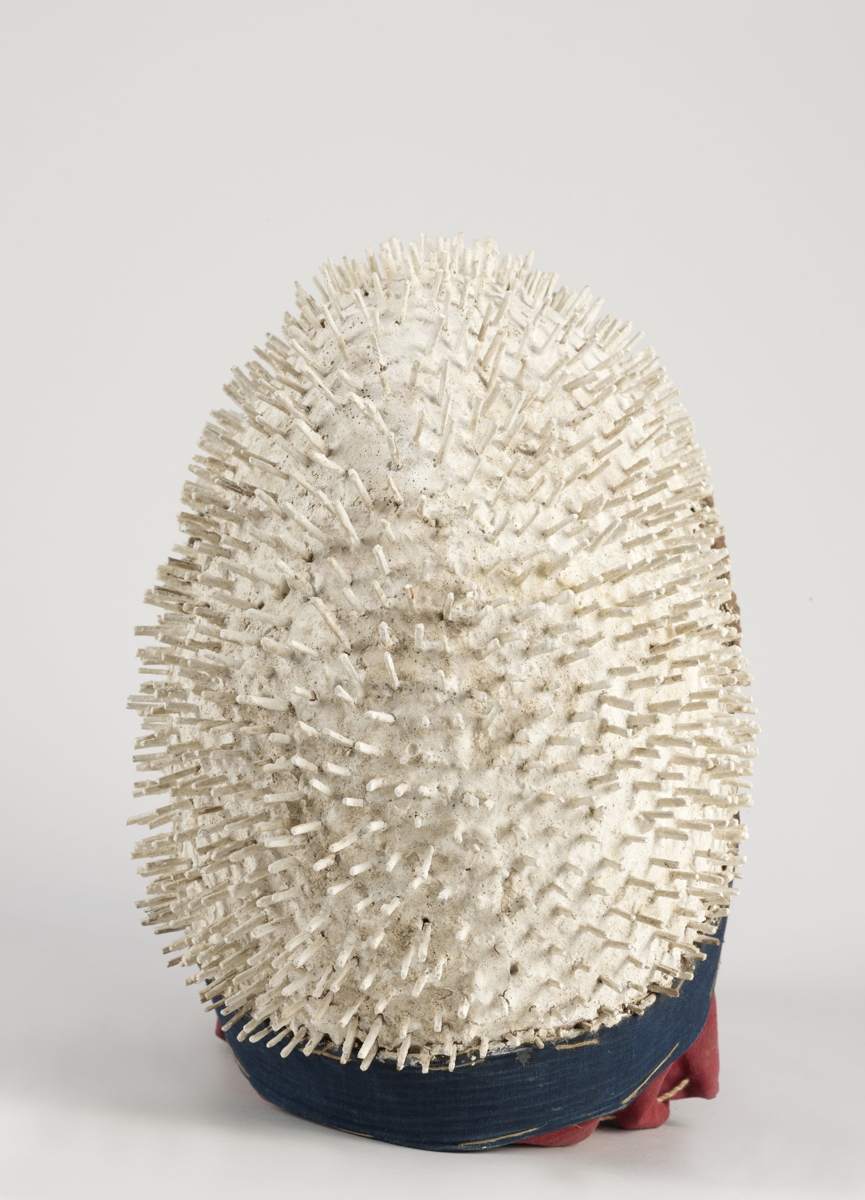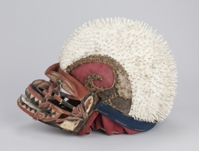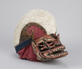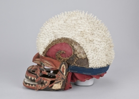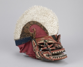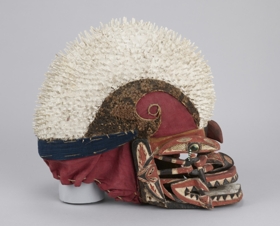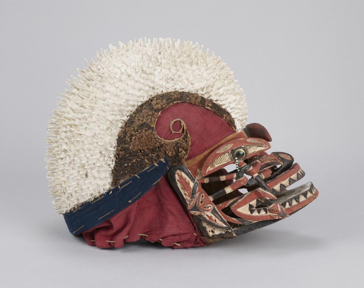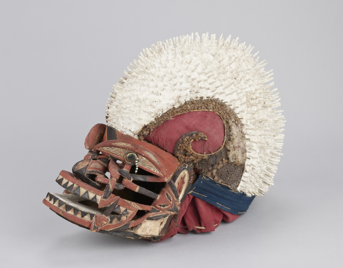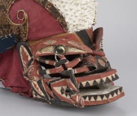 Arcrésze puha faanyagból áttörten faragott. Előreugró szája nyitott, a fogakat háromszög alakú, váltakozóan fekete és fehér színű festés jelzi. Két oldalt madárfej faragvány van, ezekből indul ki az áttörten faragott arcrész változatos díszítése. Az orr nyomott, áttört. A homlok előtt kiugróan faragott szemöldök van, az egyiken középen lelapított, gömb alakú, zöldes színű kőzet jelzi a szemet, a másikon csak a szemgödör látszik. Az arc díszítése vörös, fehér, fekete festékből, valamint feketével rovátkolt motívumokból adódik. Az arcrészhez kötözéssel van felerősítve a fejrész, mely rotang vázra erősített, barnás színű faháncs anyagból készült. Kívül a fejrész fehér festéssel van díszítve, az alapból pedig sündisznószerűen kis fadarabkák állnak ki. A homlok fölötti része, vörös textil anyagból van, ugyanilyen anyag van a fej hátsó peremére erősítve.