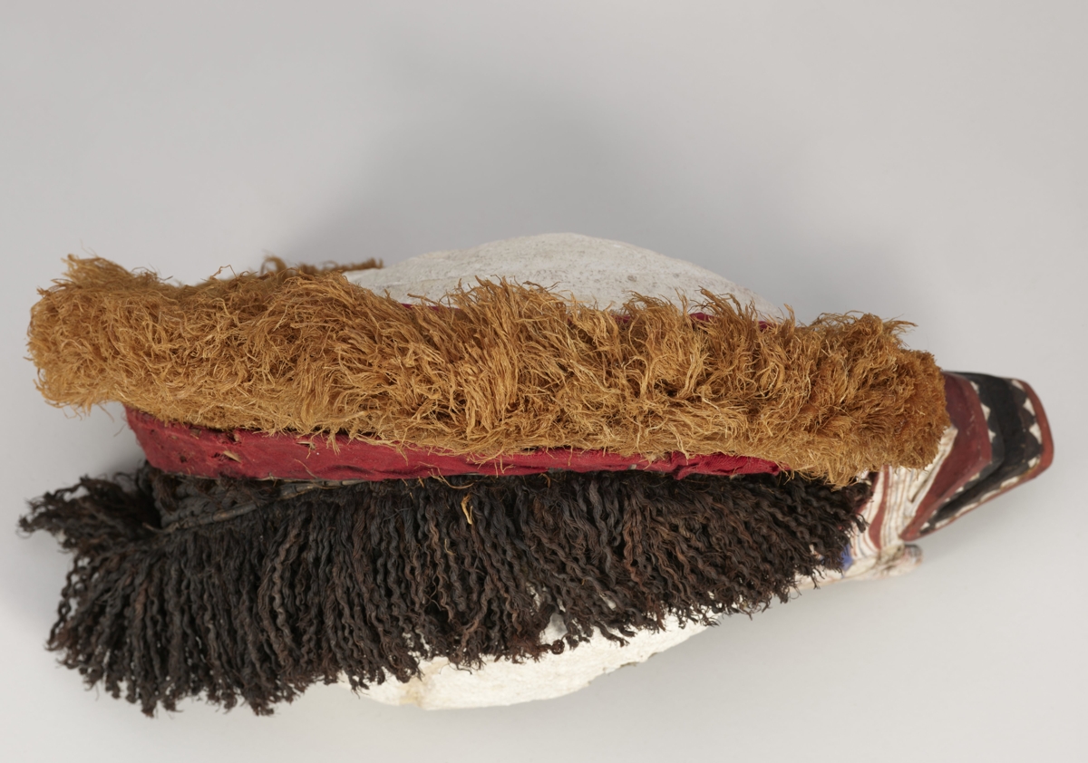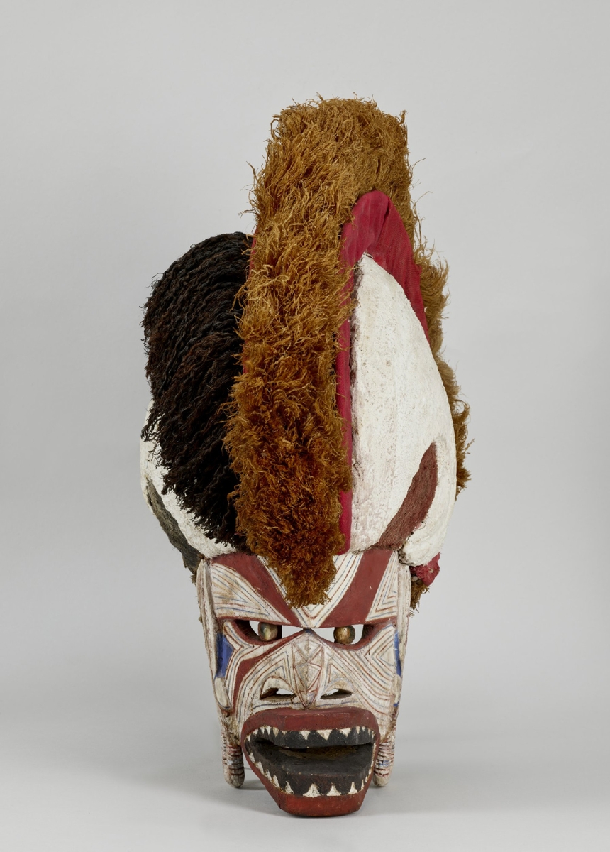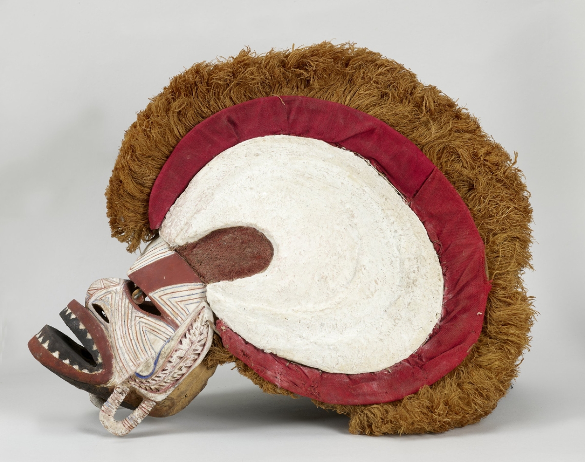 Arcrésze puha faanyagból faragott, antropomorf. A szemet két áttört ovális jelzi, a szemgolyó az egyik szemüregben zöldes kagylódarab. Az orrcimpák áttörtek, az előreugró száj szintén. A fogakat váltakozó fekete-fehér színezés jelzi. Az arcot fehér-kék-vörös vonalkázás díszíti. A fejrész spanyolnádvázra erősített faháncsból áll, középen hosszanti irányban barnás színű növényanyag van taréjszerűen, piros textíliával szegélyezve. Az egyik oldalon fehér színű anyag van, a másikon hasonló anyag fekete növényi rojtokkal.