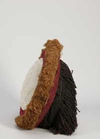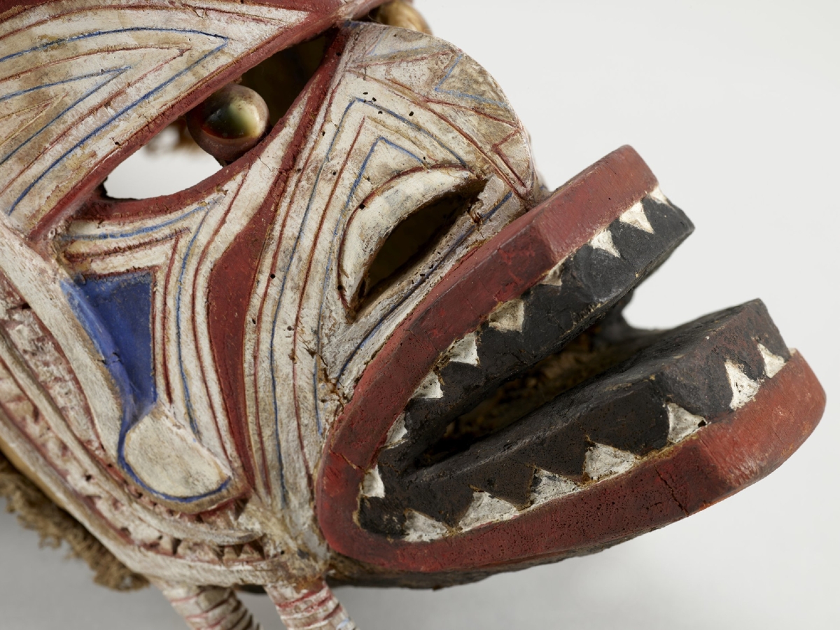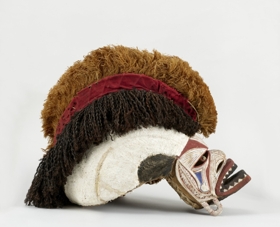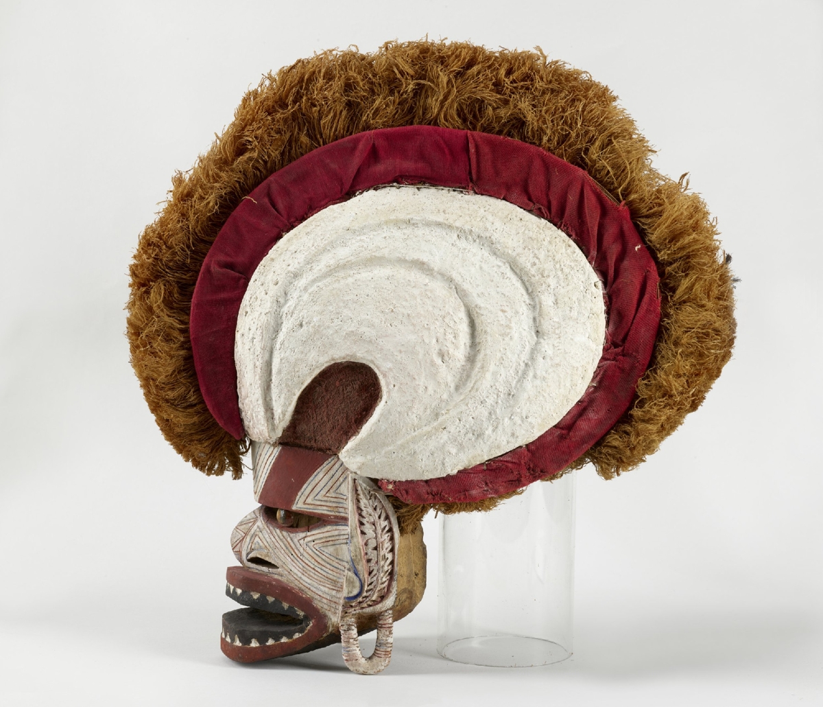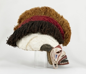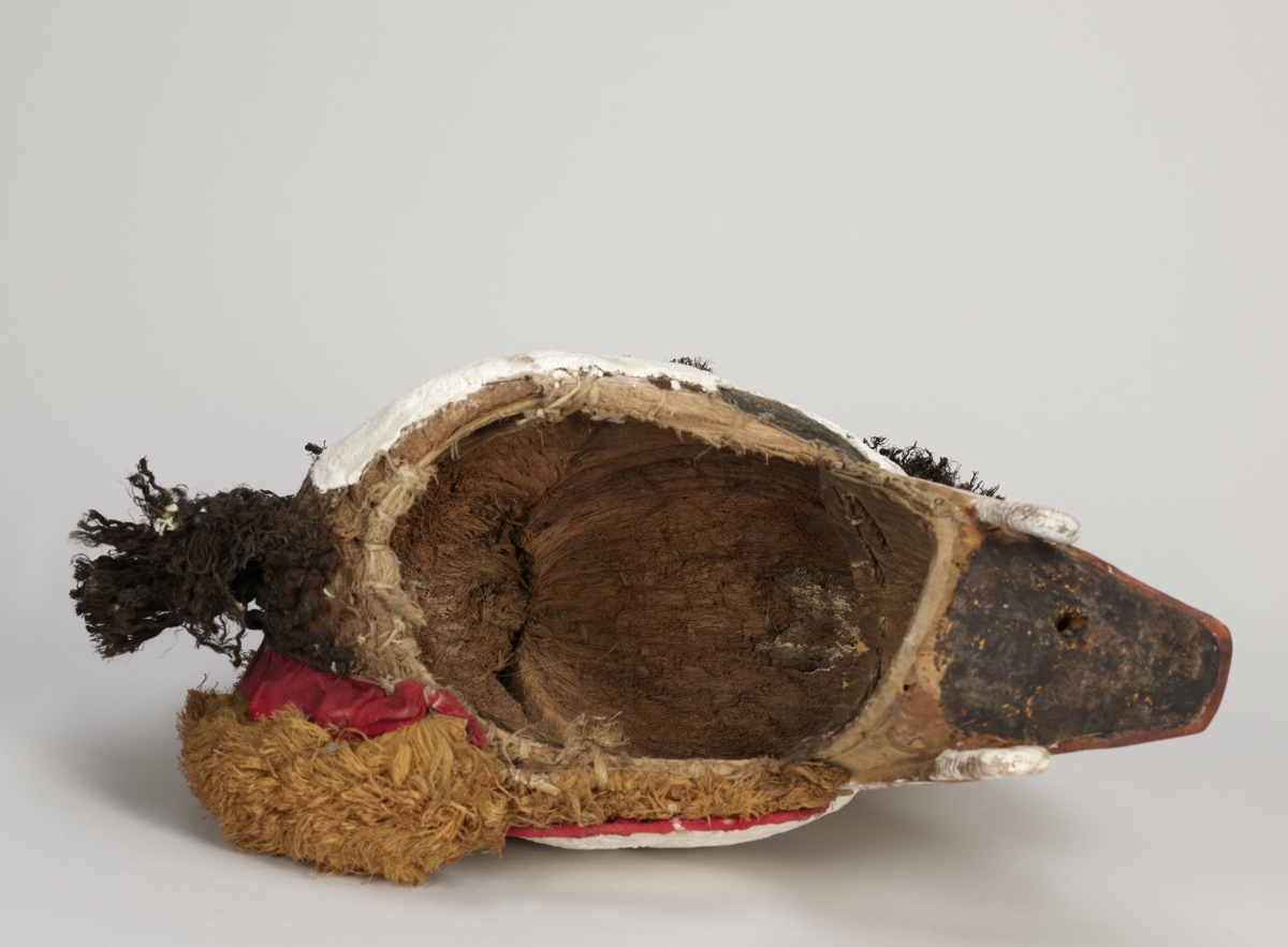 Arcrésze puha faanyagból faragott, antropomorf. A szemet két áttört ovális jelzi, a szemgolyó az egyik szemüregben zöldes kagylódarab. Az orrcimpák áttörtek, az előreugró száj szintén. A fogakat váltakozó fekete-fehér színezés jelzi. Az arcot fehér-kék-vörös vonalkázás díszíti. A fejrész spanyolnádvázra erősített faháncsból áll, középen hosszanti irányban barnás színű növényanyag van taréjszerűen, piros textíliával szegélyezve. Az egyik oldalon fehér színű anyag van, a másikon hasonló anyag fekete növényi rojtokkal.