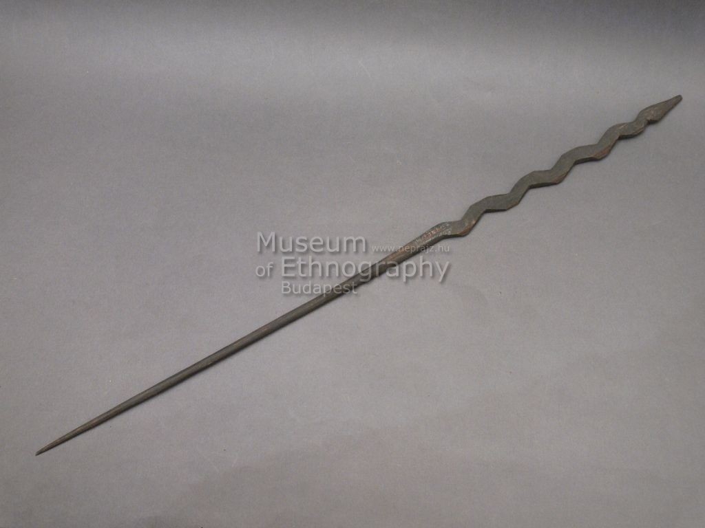 Hosszúkás, feketés színű fából faragott, hegyes pálcika, felső részén a fogó kígyót alakban hullámzik, feje is ki van faragva. Bíró-jegyzet: 556.