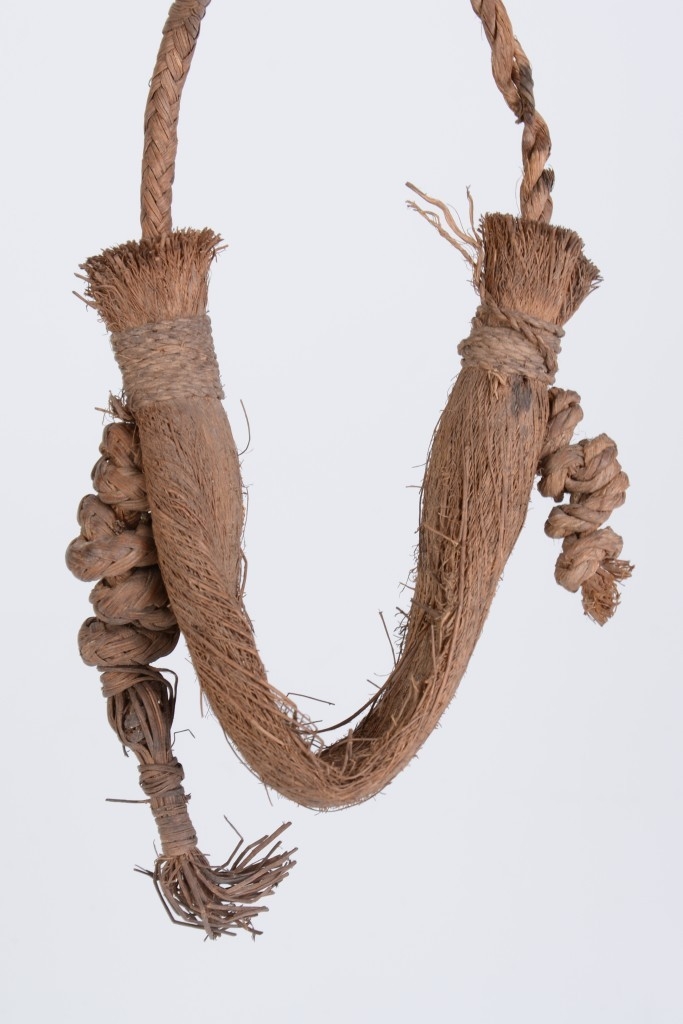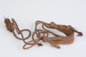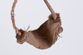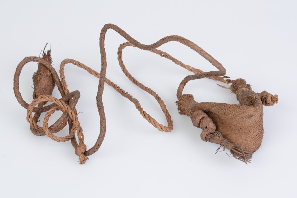 A parittyakő elhelyezésére szolgáló, félbehajtott növényi háncsdarab (pálma?) egyik végéhez fonott, a másikhoz sodort zsinegdarabot erősítettek olyan módon, hogy a háncsdarab két végét rosttal körülkötözve hozzászorították a zsineghez. A fonott zsineg végéhez háncsbojtot erősítettek. A kő elhajításakor valószínűleg a parittya ezen vége maradt a dobó kezében.