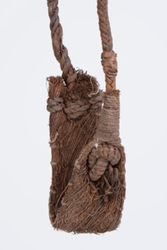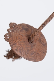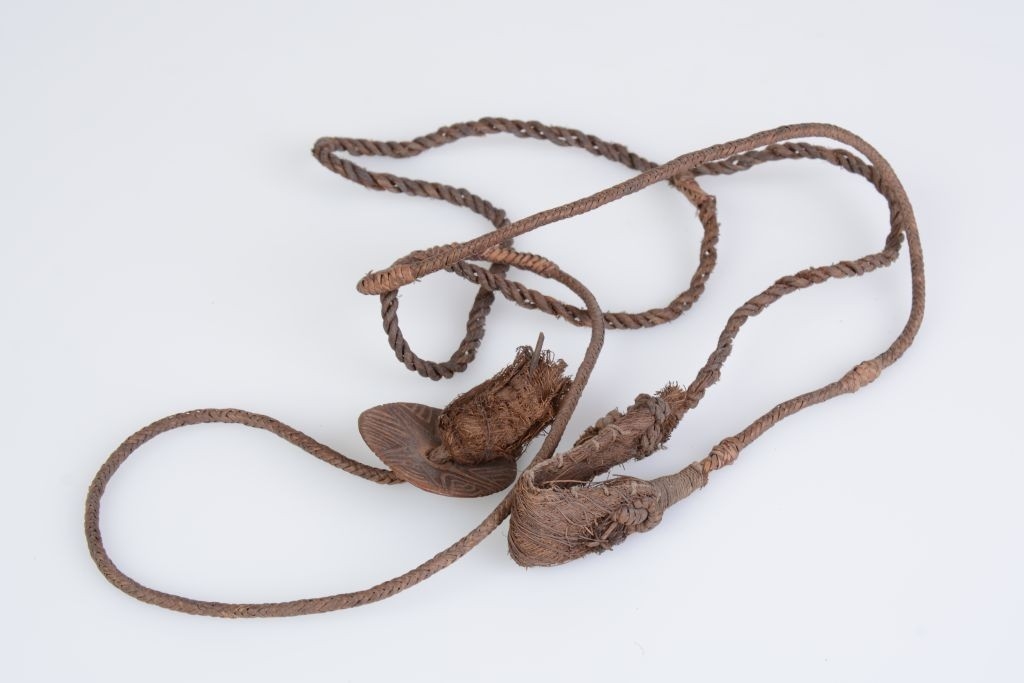 A parittyakő elhelyezésére szolgáló, félbehajtott és összevarrt növényi háncsdarab (pálma?) egyik végéhez fonott, a másikhoz sodort zsinegdarabot erősítettek olyan módon, hogy a háncsdarab két végét rosttal körülkötözve hozzászorították a zsineghez. A fonott rostzsineg végére egy átlyukasztott kókuszkorongot húztak, melynek mindkét oldalát vésett geometrikus díszítés borítja, illetve peremének egyik szakaszát áttört elemek díszítik. A korong lecsúszását egy háncsbojt akadályozza meg. A kő elhajításakor valószínűleg a parittya ezen vége maradt a dobó kezében.
